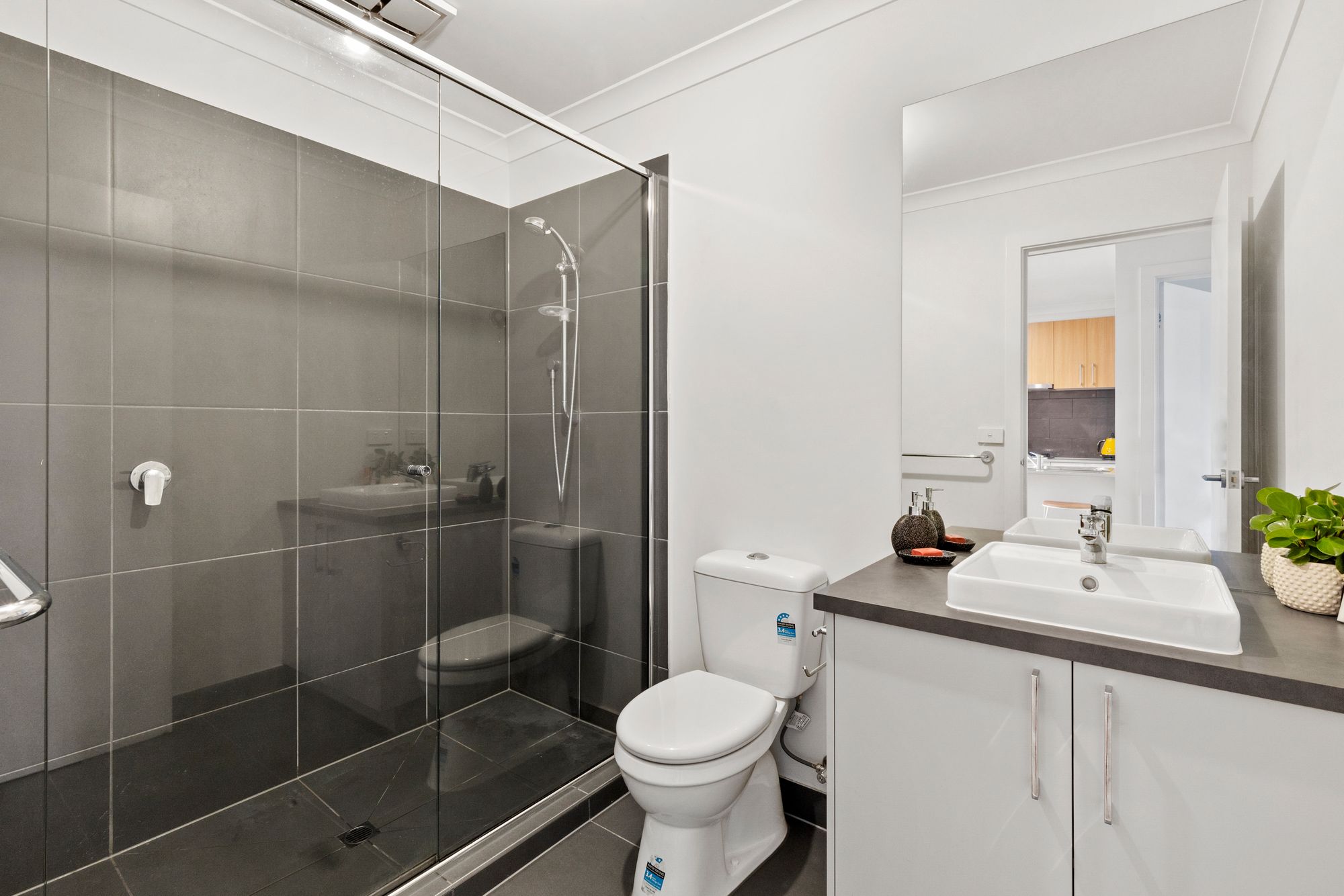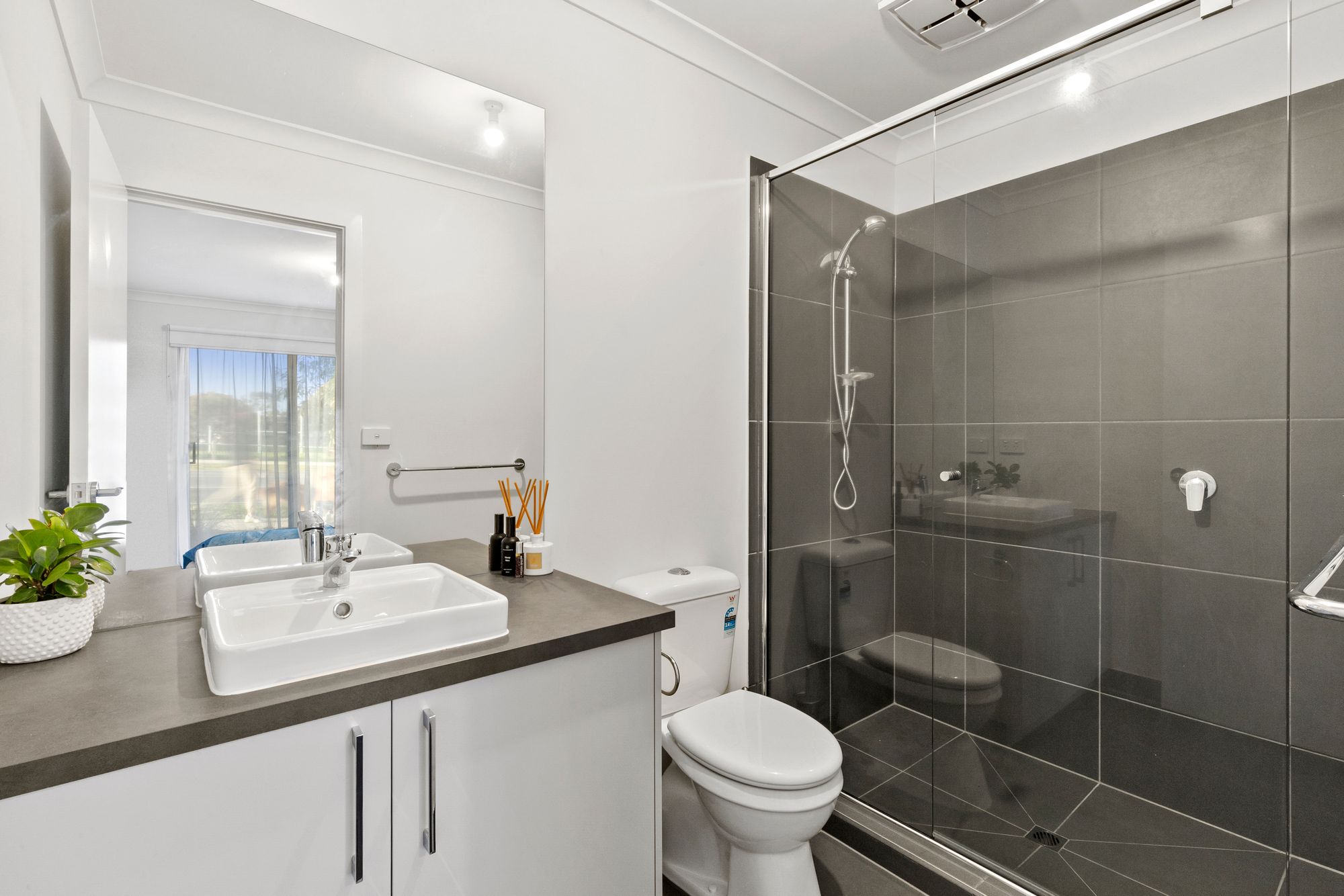 Ensuite: Semi-frameless shower, extended shower, hand-held shower head, single mirror vanity with cabinetry, chrome fittings and toilet.