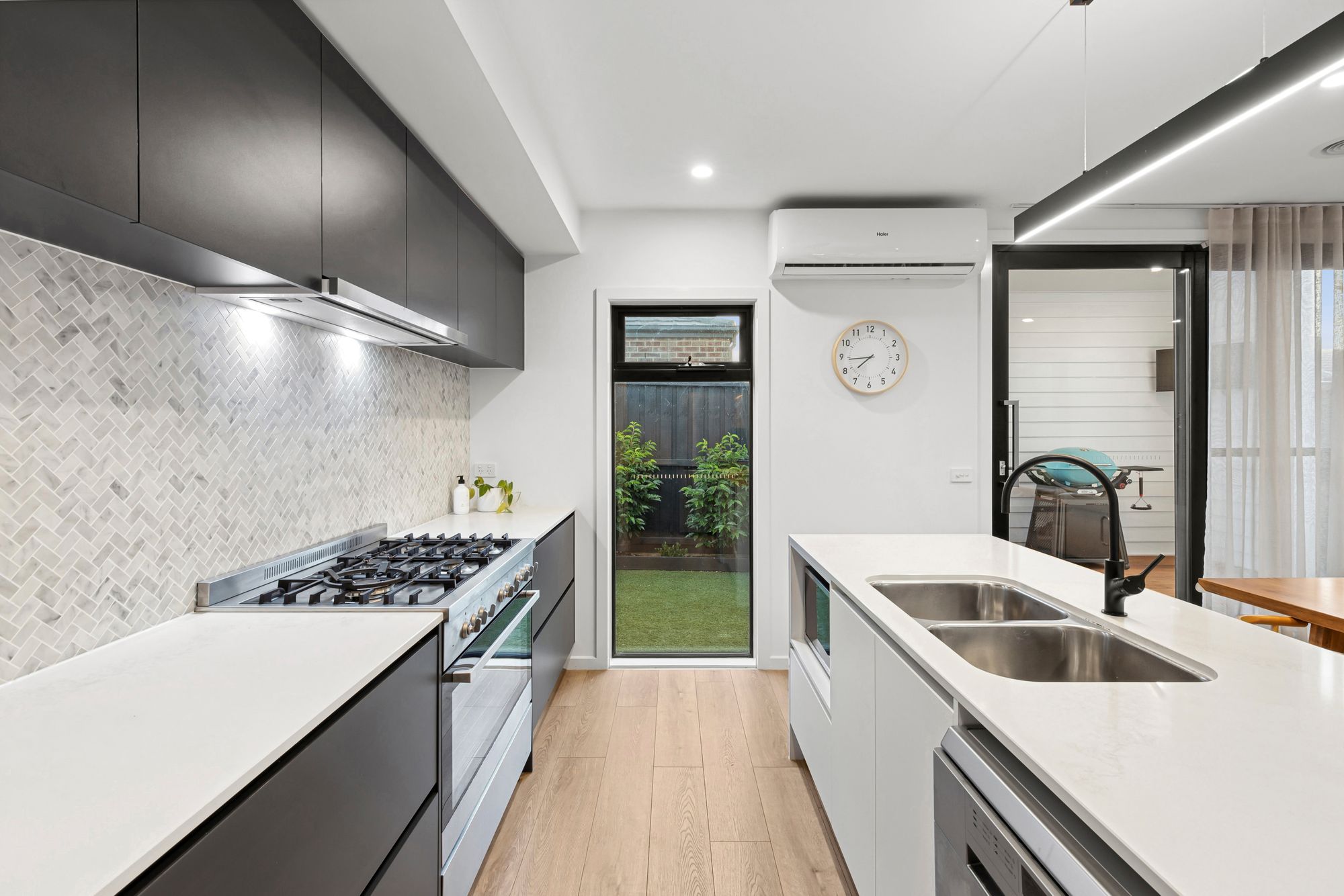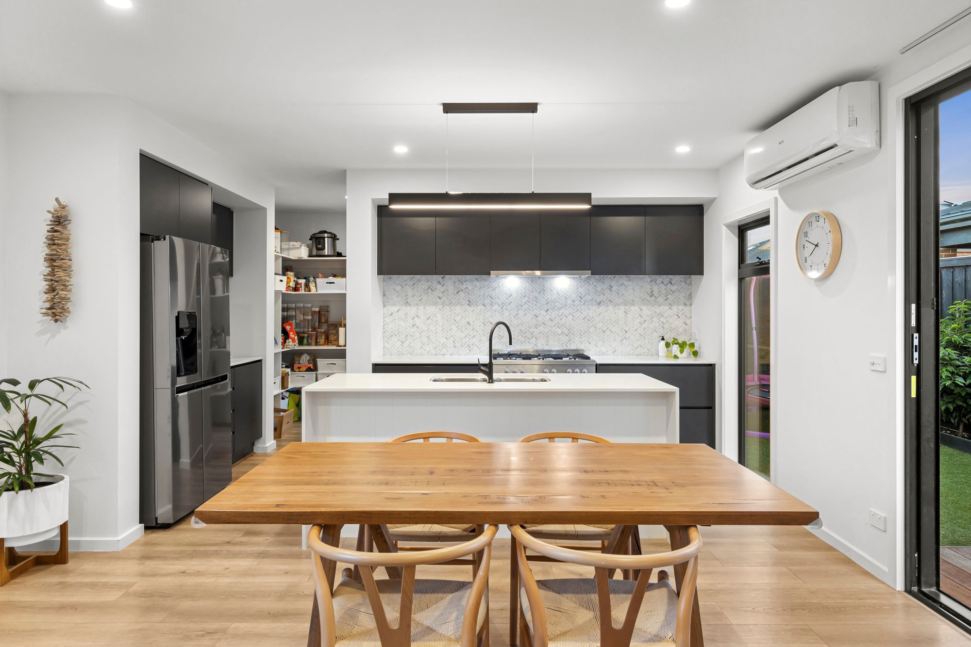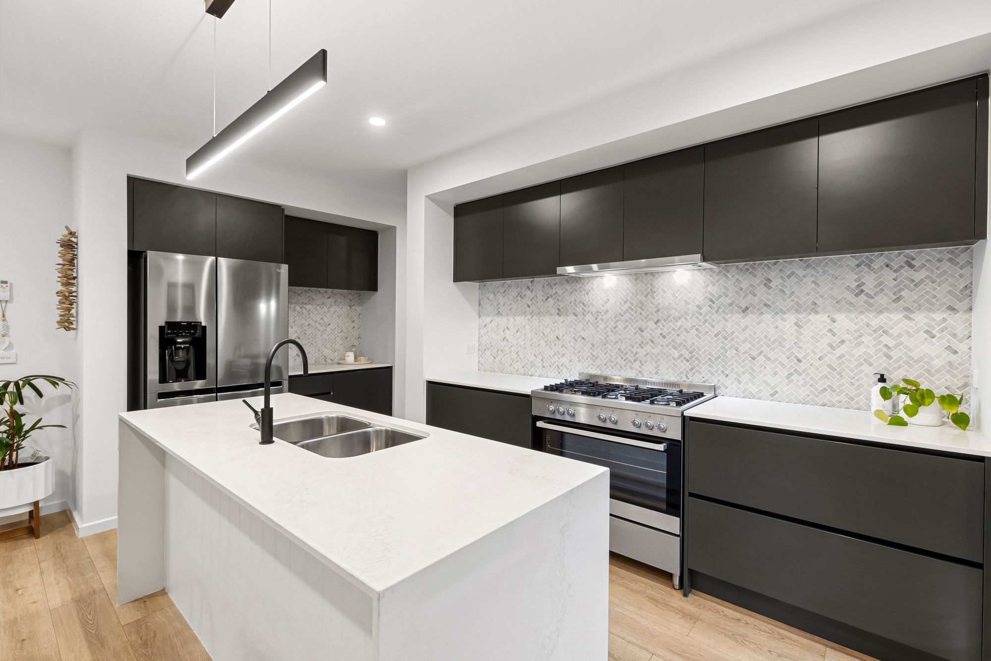 Kitchen: 20mm stone waterfall benchtop, matte black accents, feature tile splashback, 900mm built-in appliances and hidden range hood, feature under-mount sink, walk-in pantry, overhead cabinetry, dishwasher, feature pendant lighting, downlights, ducted heating, split system cooling