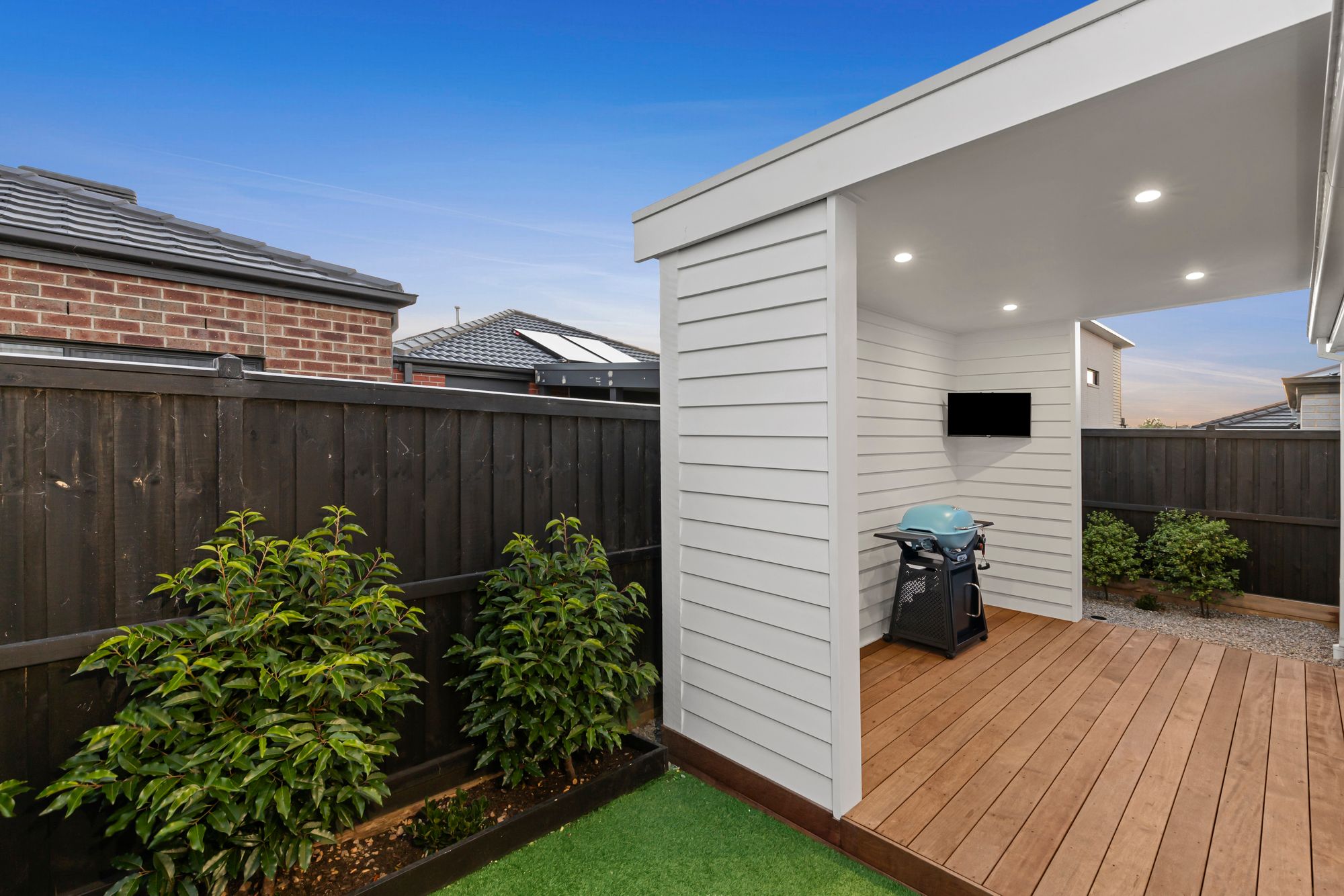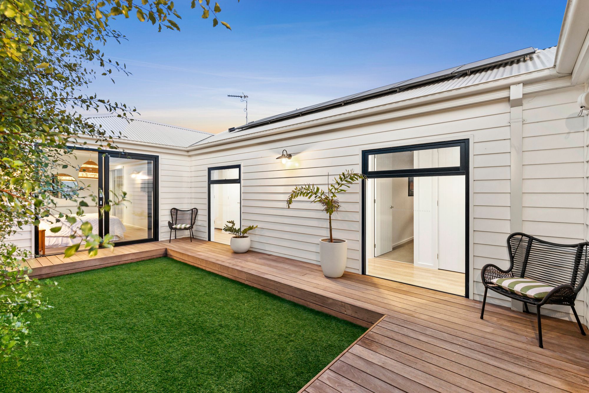 Outdoor: Pergola with decking, open space courtyard, grassed area, single side gate access, solar panels providing 2.5KW of power