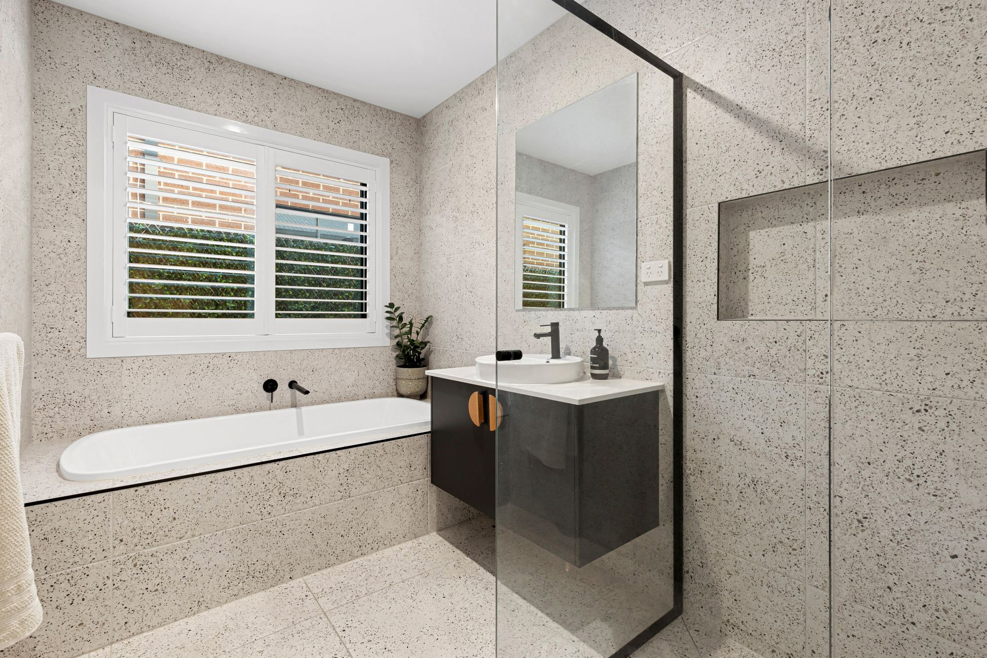 Main bathroom: Feature tiles, 20mm stone vanity with ample storage, semi-frameless shower, shower niche, bath, double glazing, raised ceilings and door frames, floor-to-ceiling tiles, and seperate toilet.