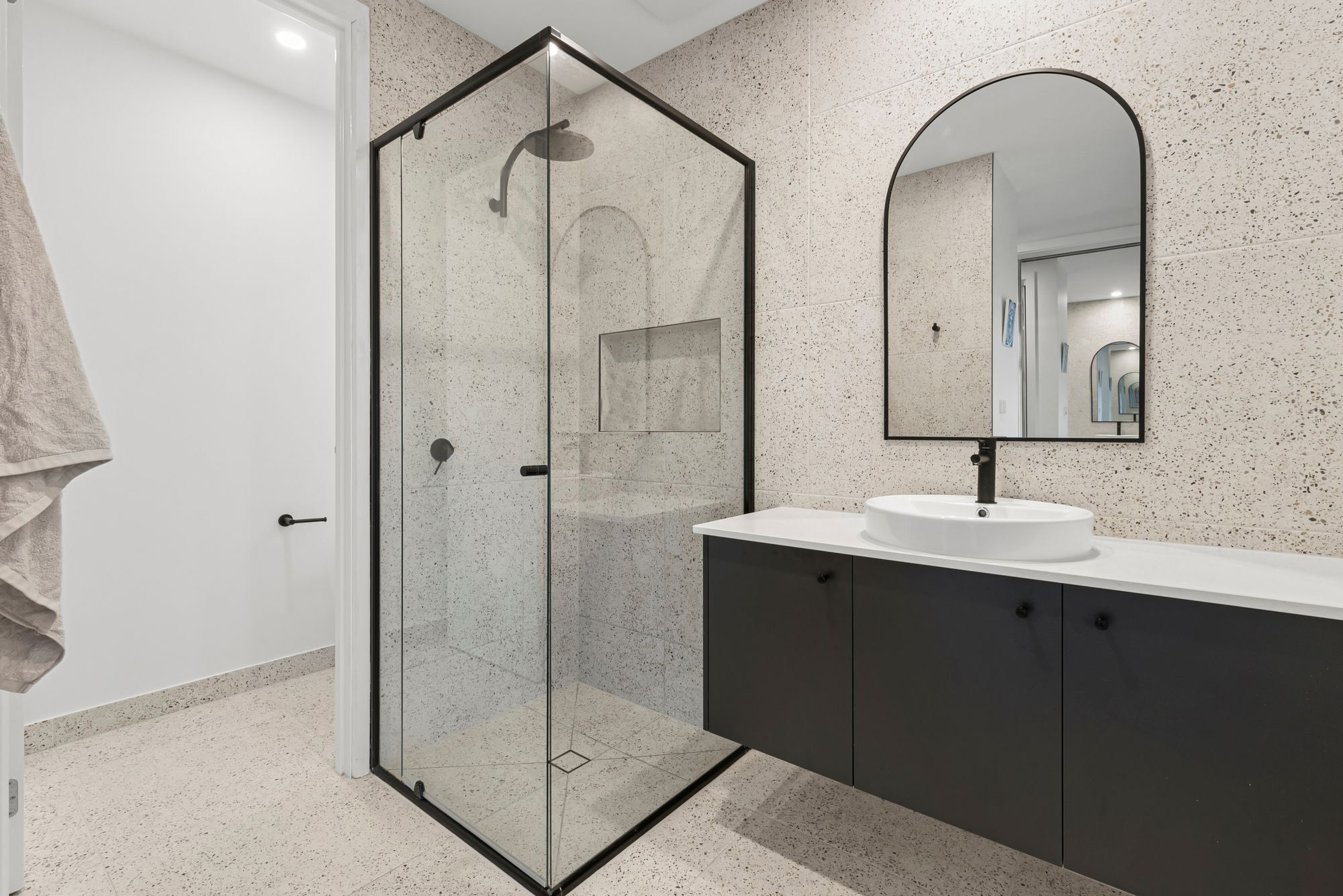 Ensuite: Single vanity with ample storage, frameless shower with niche and matte black shower head, floor-to-ceiling tiles, towel rack