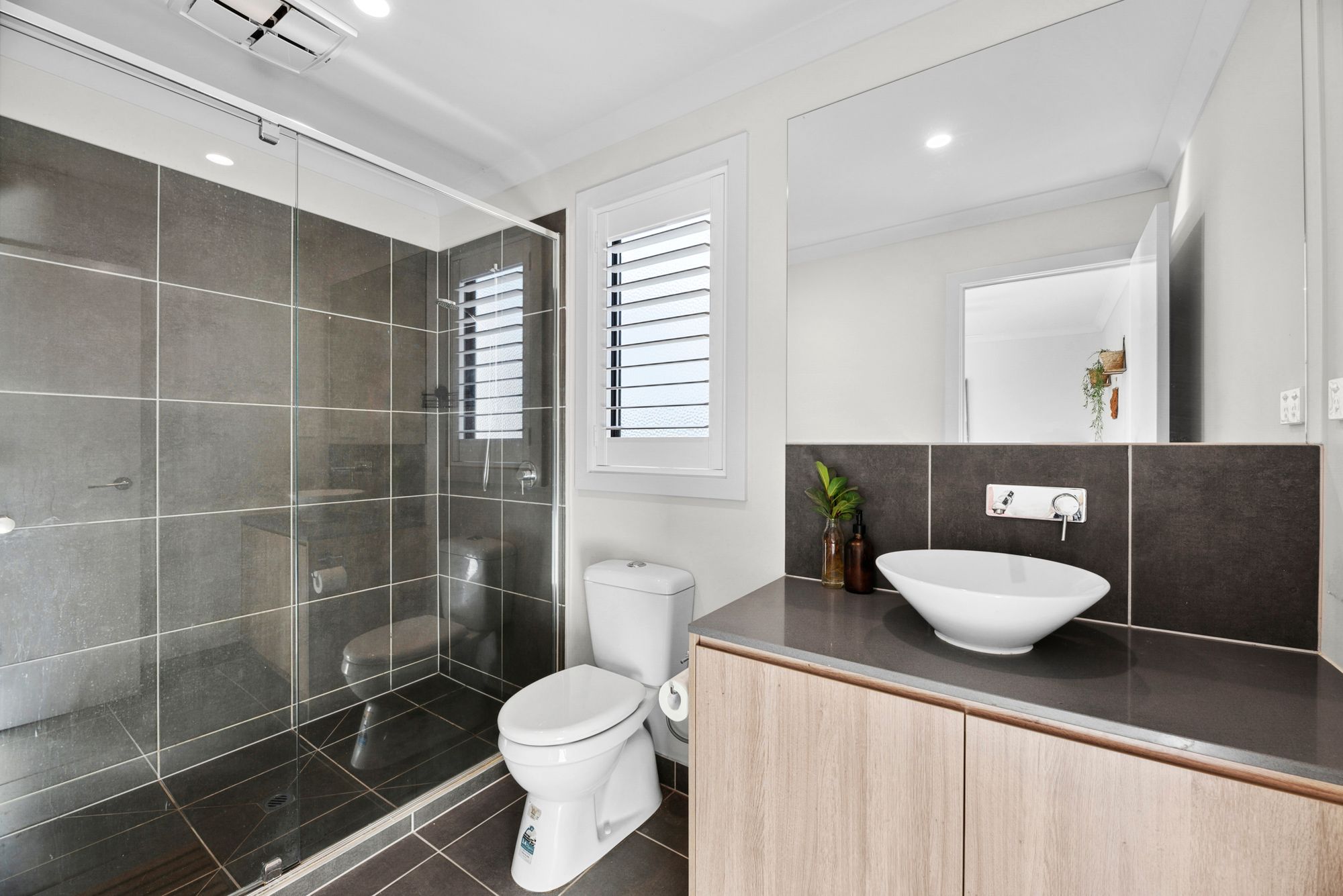 Ensuite – Large shower with wall mounted showerhead, single sink and large 20mm stone benchtop vanity with ample storage, plantation shutters, toilet, large mirror splashback and chrome fittings.
