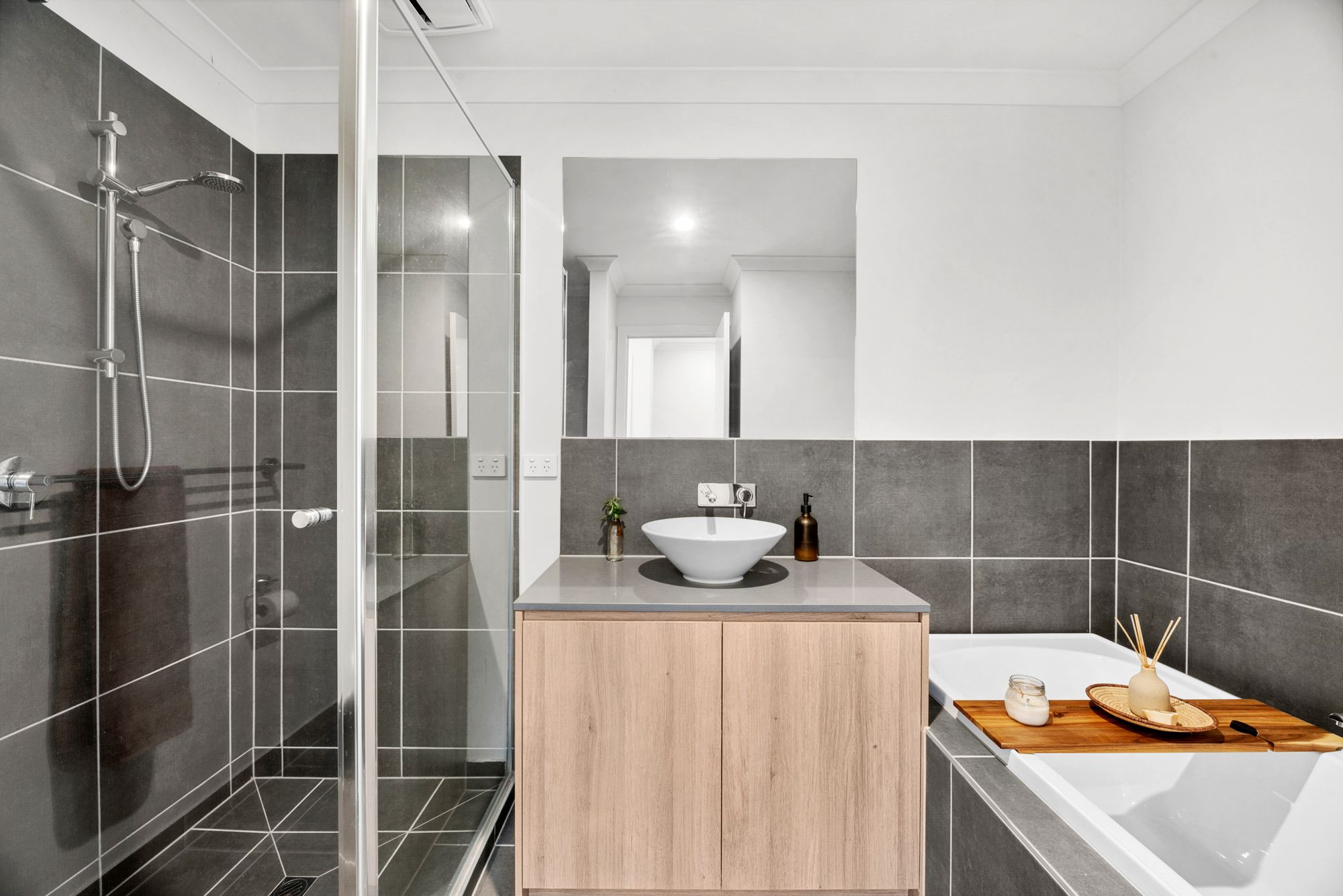 Main Bathroom – Shower, raised bath, single sink and 20mm stone benchtop vanity with ample storage and chrome fittings, window with plantation shutters.