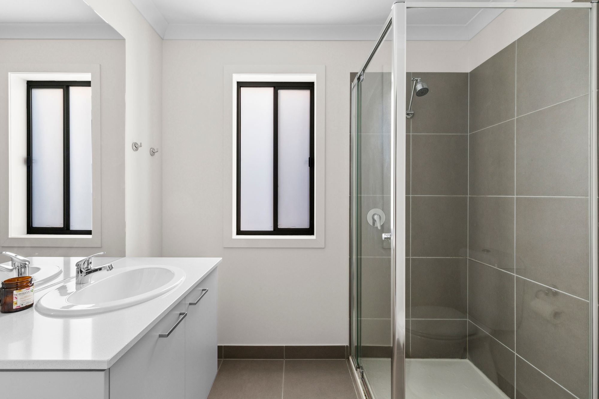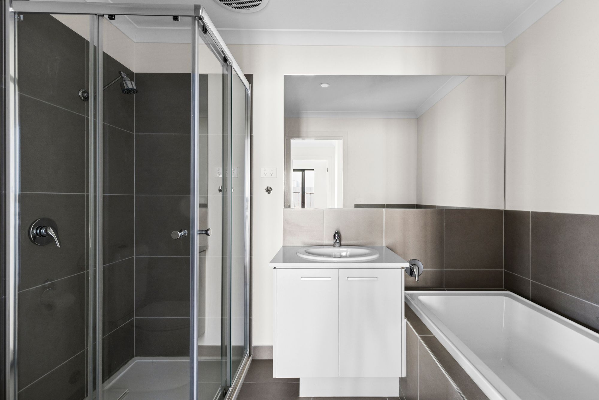 Main bathroom: semi frameless shower with hand held shower head, bath, tiles, basin and storage vanity, tile and mirror splash back, 20mm stone benchtop.
