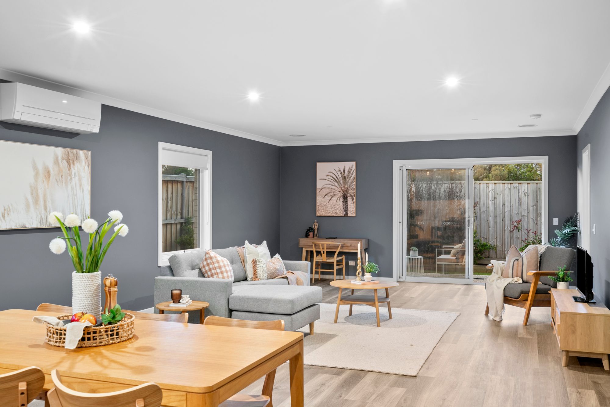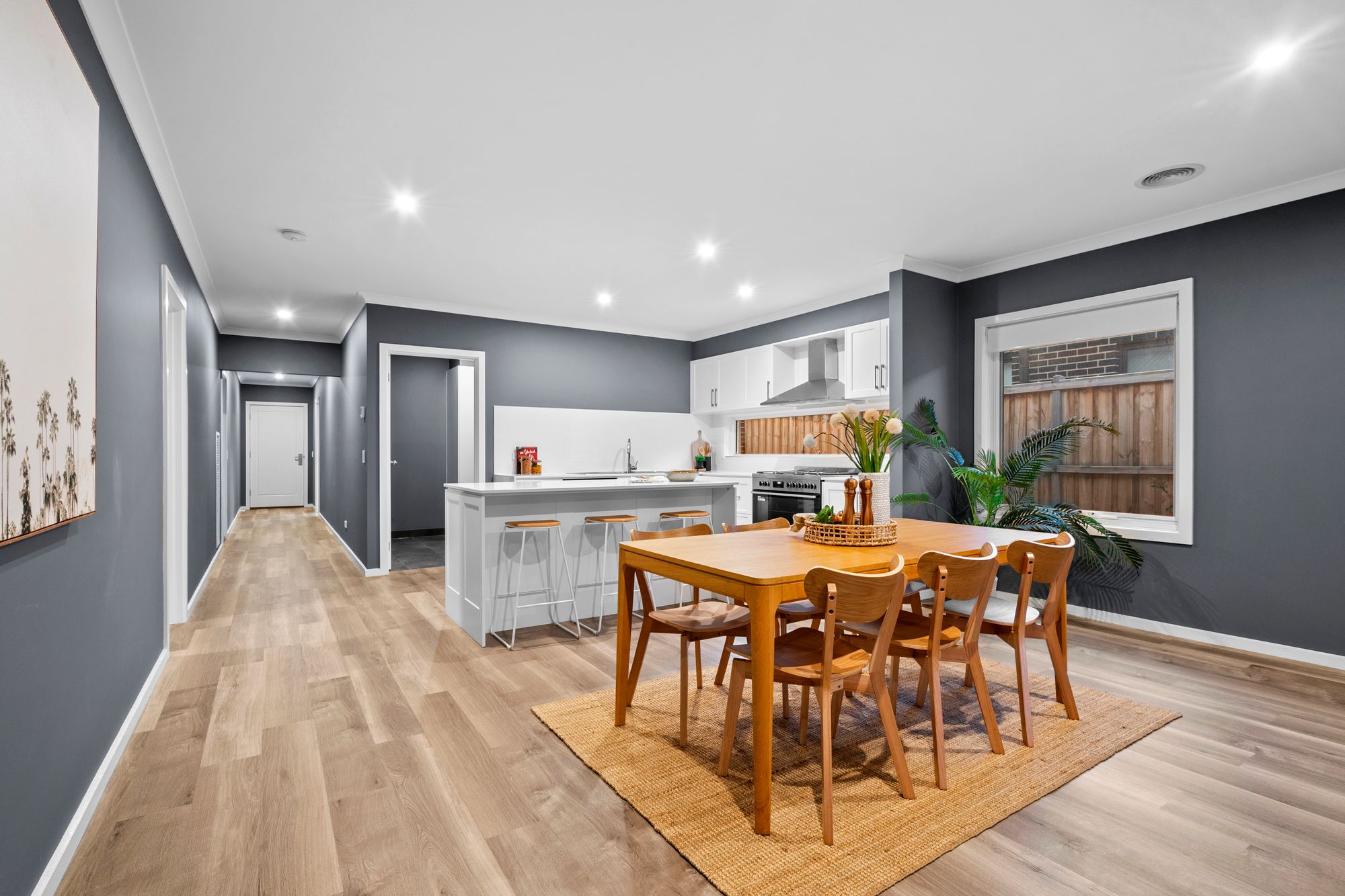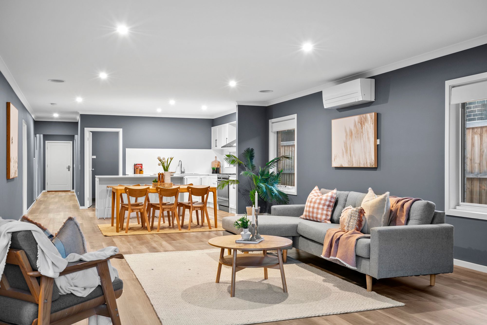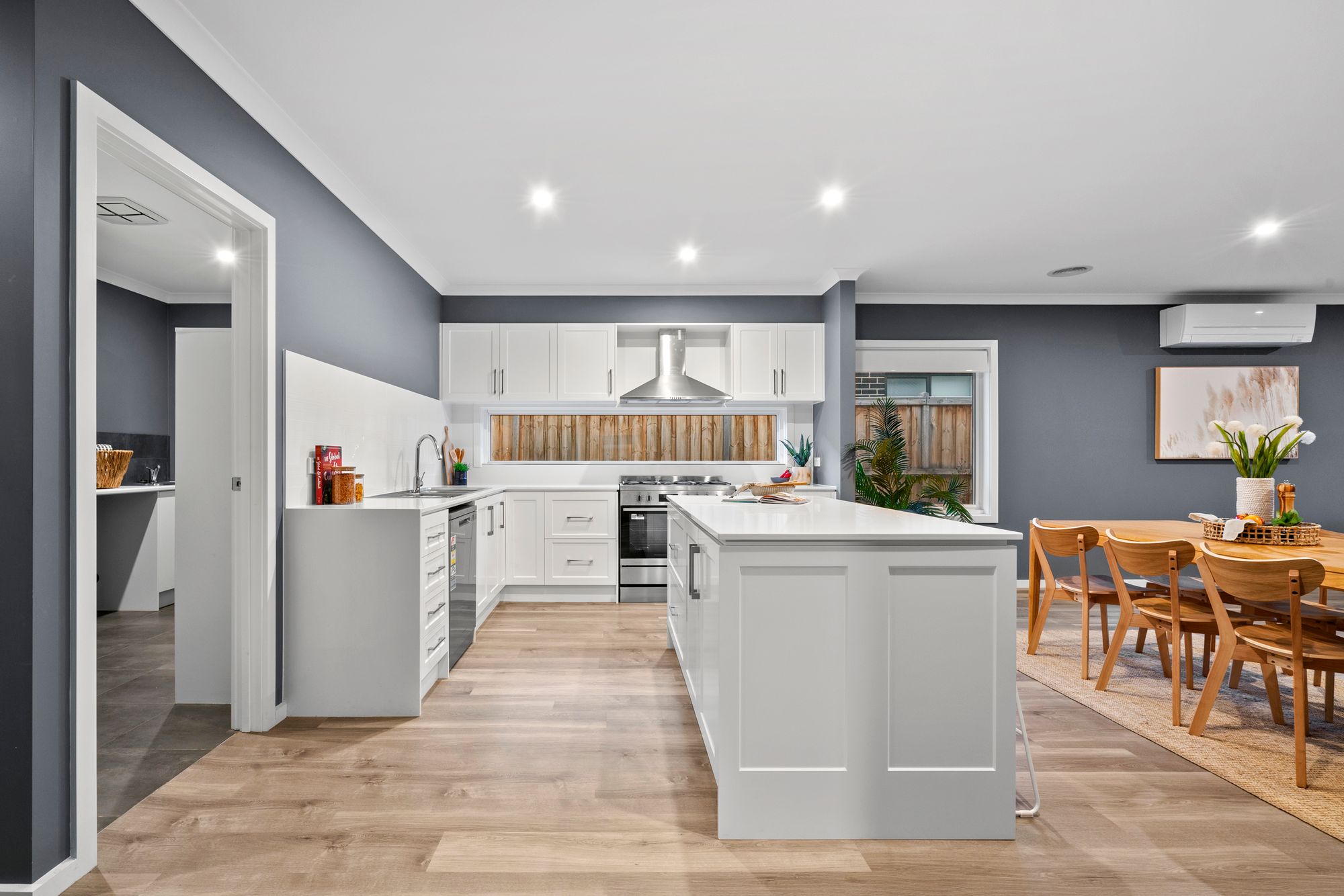 Open Plan Living/Dining: Large in all proportions and versatile in use. Ample natural light through North and West facing double-glazed windows. Roller blinds, downlights, ducted heating, reverse-cycle heating and cooling, hard-wearing laminate flooring, direct access to rear yard.