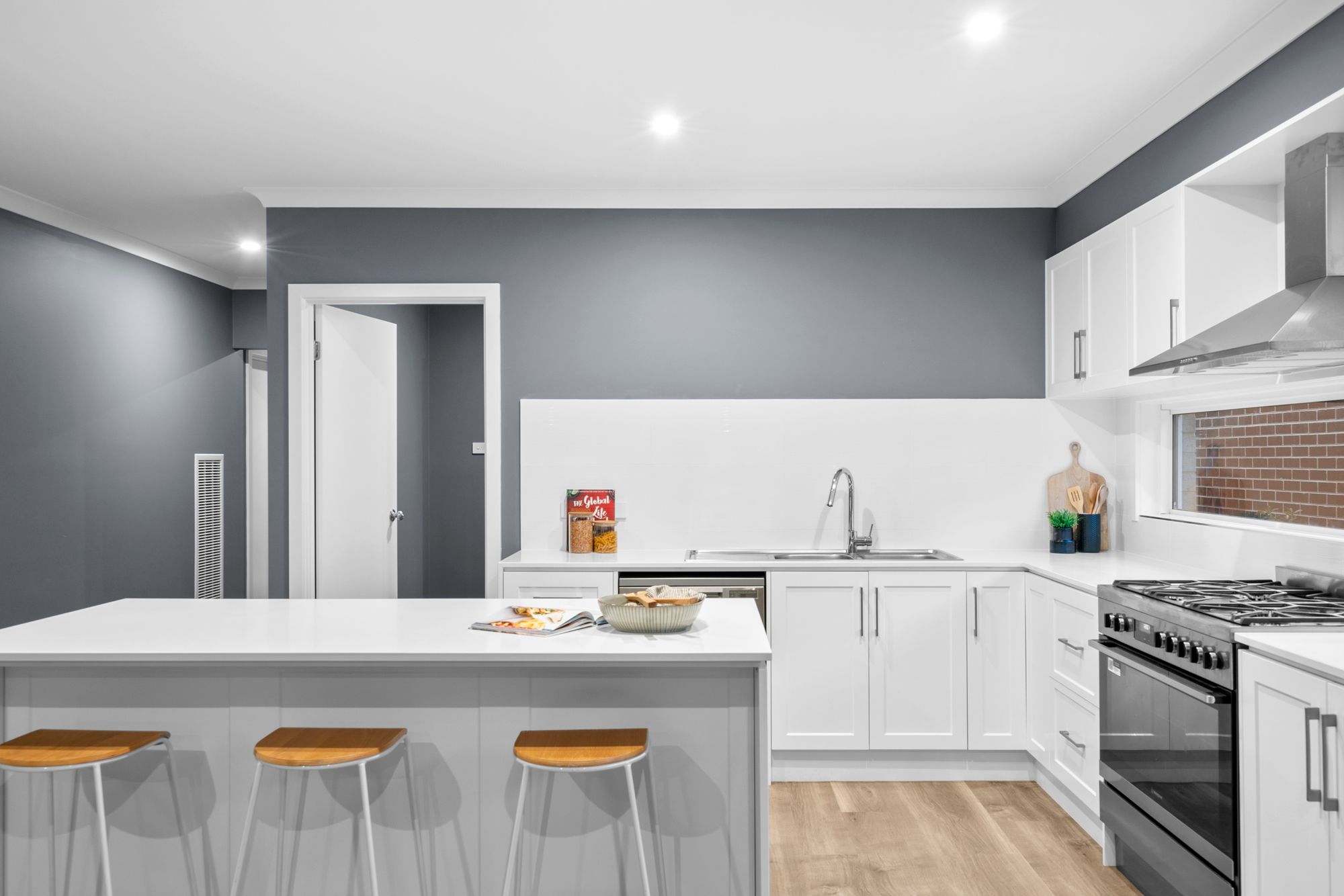 Kitchen: Adjoining walk-in pantry and Laundry with a plethora of storage options including built in shelving, microwave cavity. Shaker style cabinetry, basin and fridge cavity. Generous kitchen island bench with breakfast bar. Stone benchtops, double-glazed highlight window, and downlights. Freestanding 900mm oven and stovetop and dishwasher.