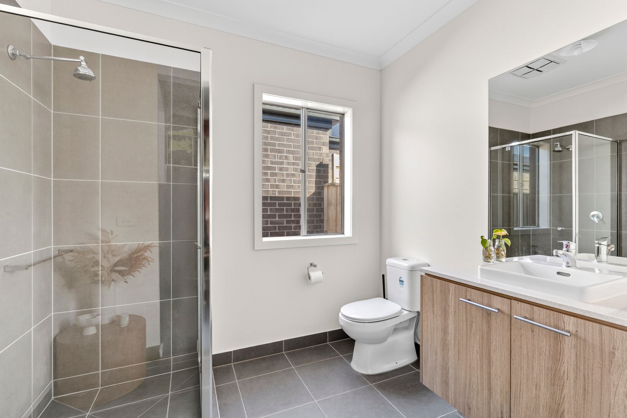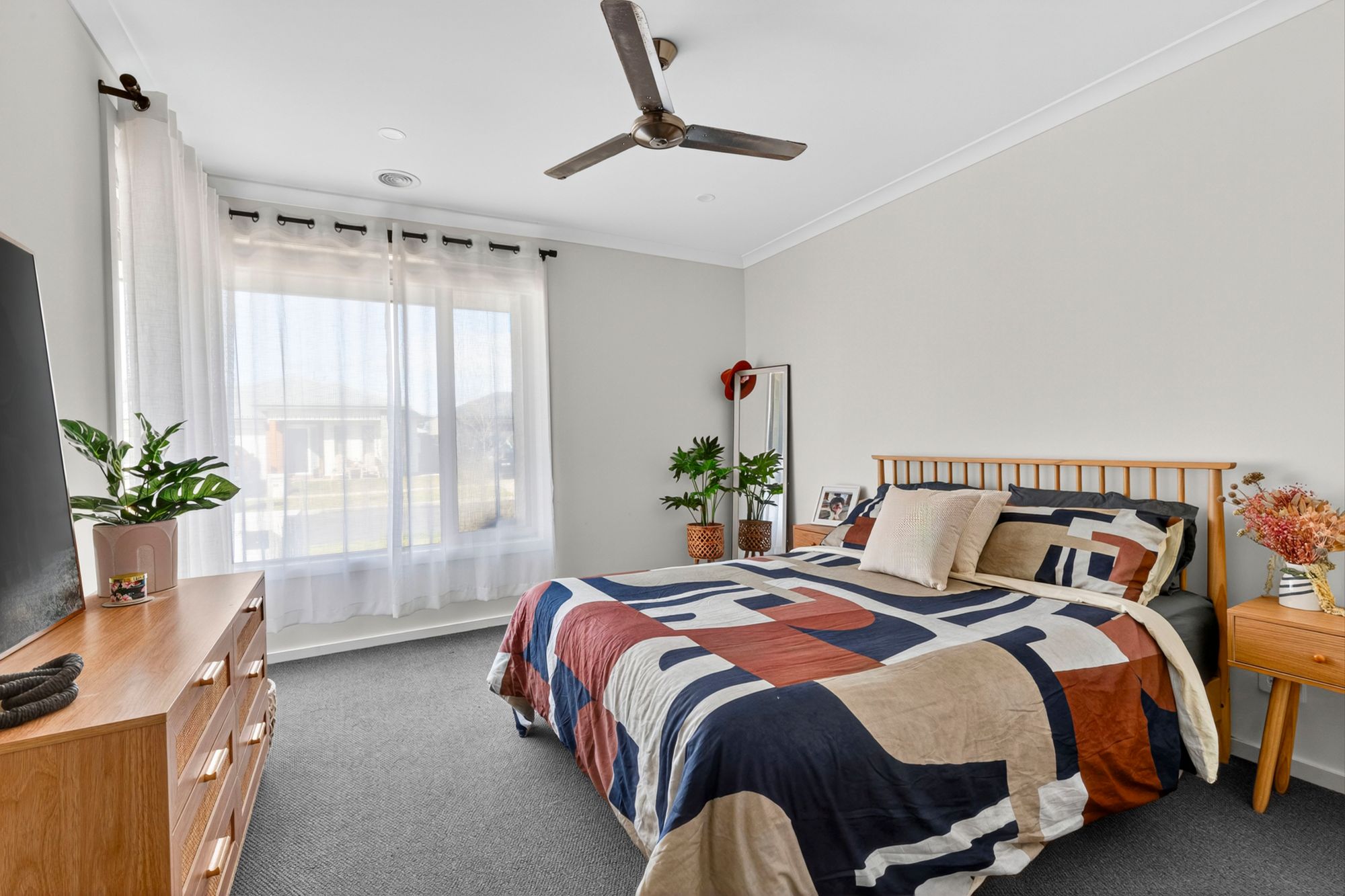 Master Suite – Positioned at the front of the home, the light-filled master bedroom is a true sanctuary. It features elegant sheer curtains, roller blinds, ducted heating, a ceiling fan, and a generous wraparound walk-in robe. The private ensuite is fitted with a tiled shower, chrome fixtures, a single basin atop a wide vanity with a mirrored splashback, and a toilet, with a window providing natural light and ventilation.