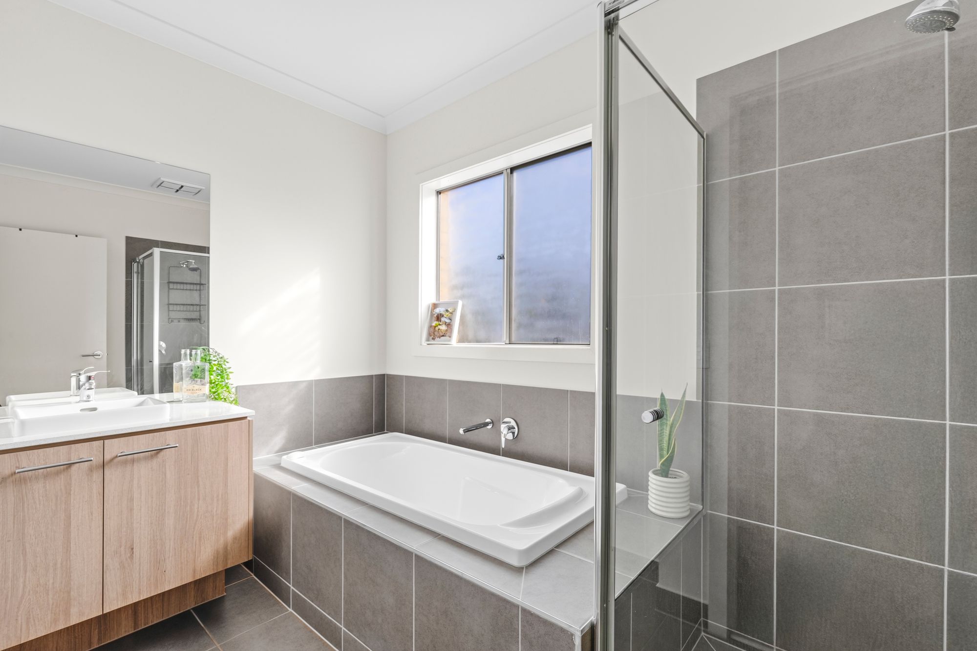 Main Bathroom – Conveniently located to service the rear bedrooms, the stylish main bathroom features a built-in bathtub, tiled shower with wall-mounted shower head, a stone-top vanity with a single basin, and a well-placed window for natural light and airflow.