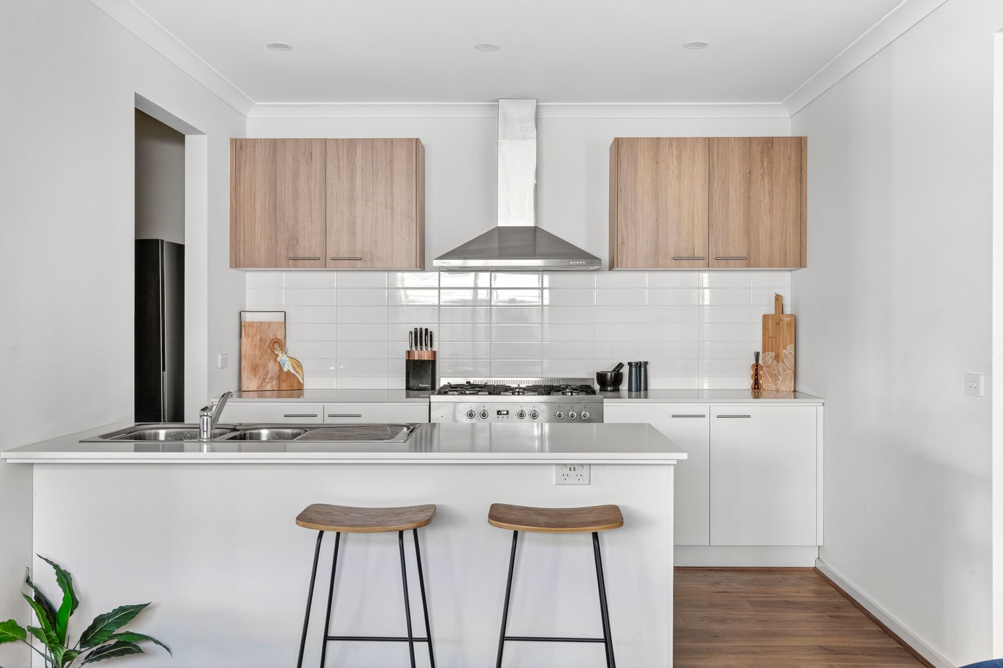 Kitchen – Spacious walk-in pantry with a plethora of storage options. Large fridge cavity. 20mm stone bench tops with generous kitchen island bench with breakfast bar overhang. Tiled splashback, downlights, overhead cabinetry. Built-in 900mm oven and stovetop, stainless steel dishwasher dual basin sink.