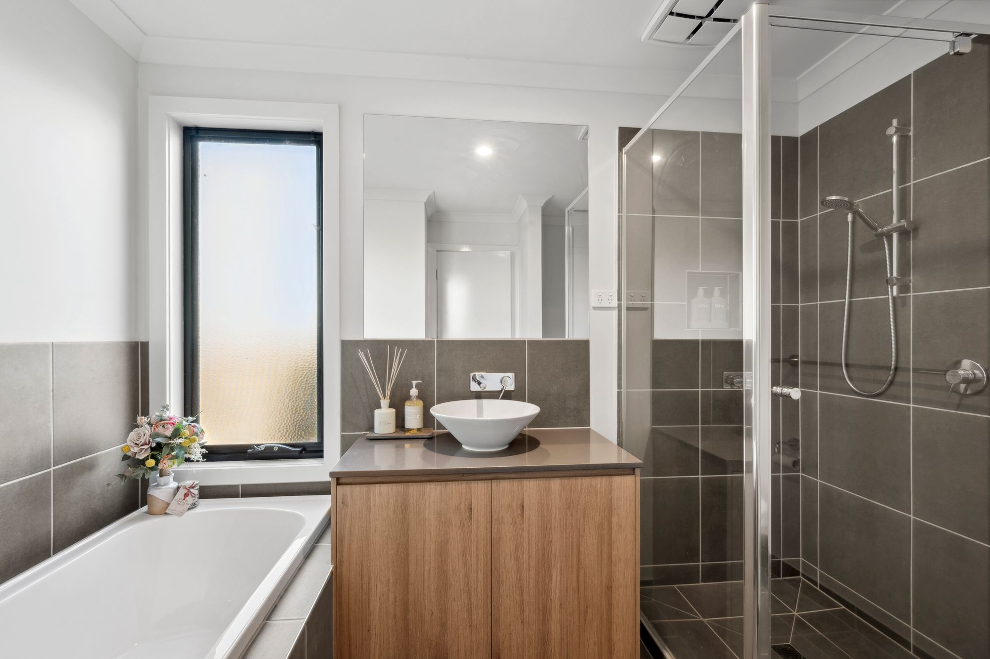 Main Bathroom – Shower, raised bath, single sink and 20mm stone benchtop vanity with ample storage and chrome fittings, frosted window