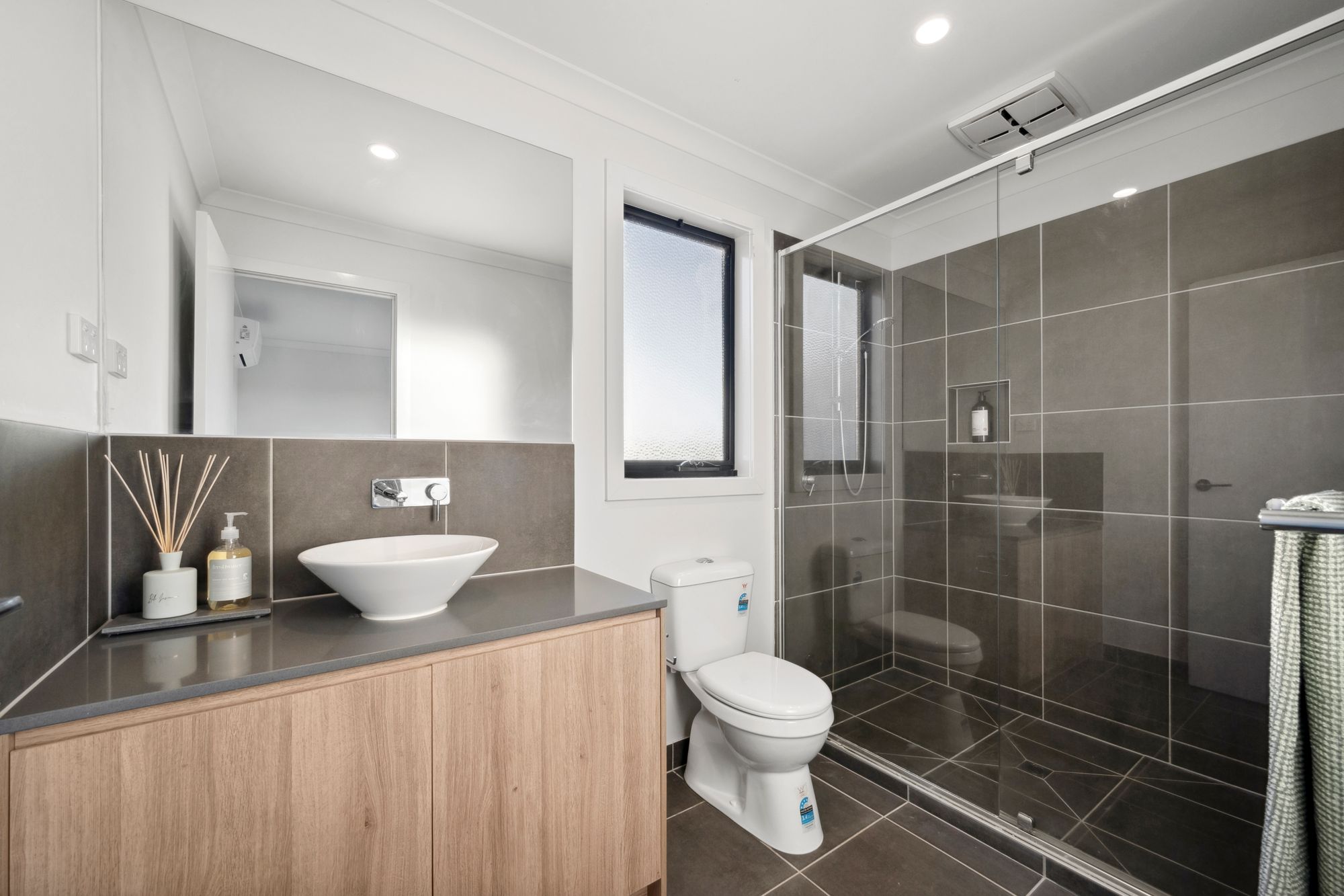 Ensuite – Large shower with wall mounted showerhead and niche, single sink and large 20mm stone benchtop vanity with ample storage, toilet, large mirror splashback and chrome fittings.