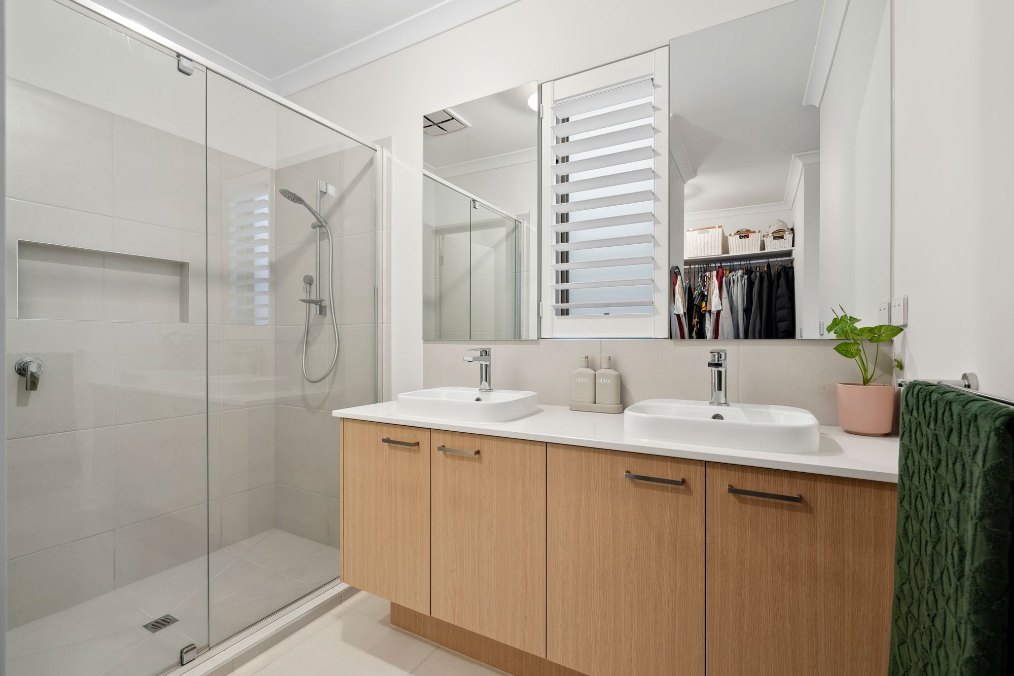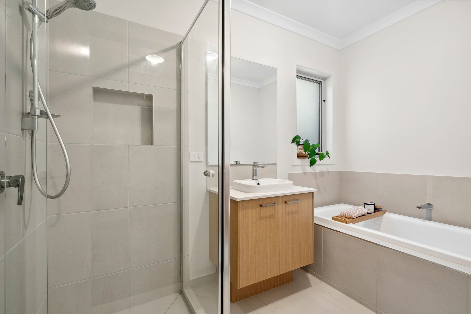 Main bathroom: Single vanity with 20mm stone benchtop and ample storage, semi-frameless shower with hand held shower head, tiled shower base, shower niche, bath, frosted glass window, seperate toilet.