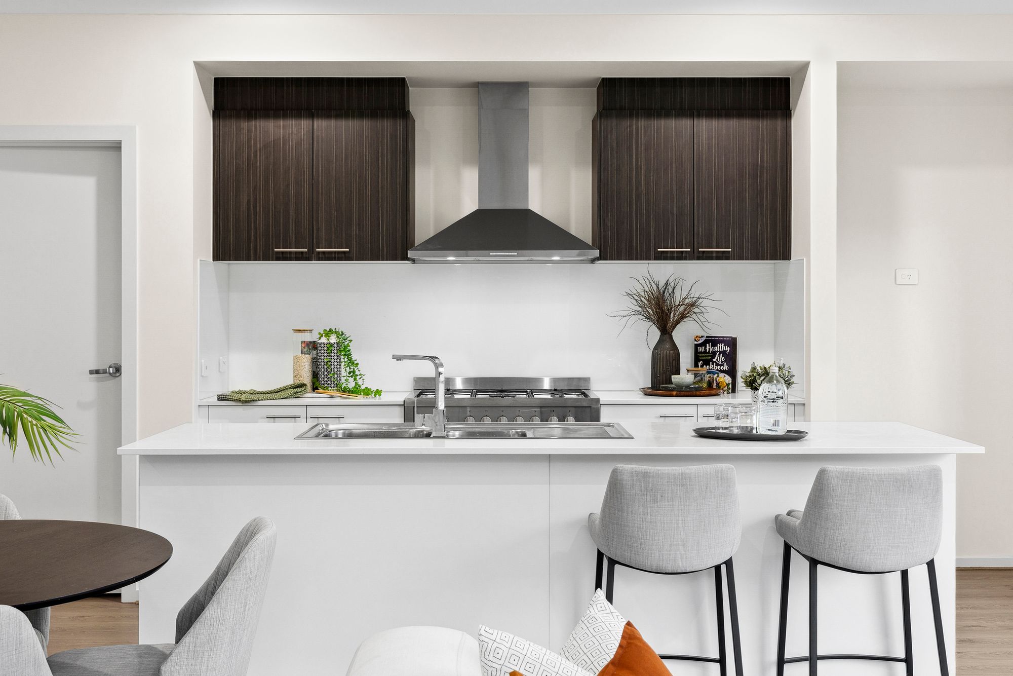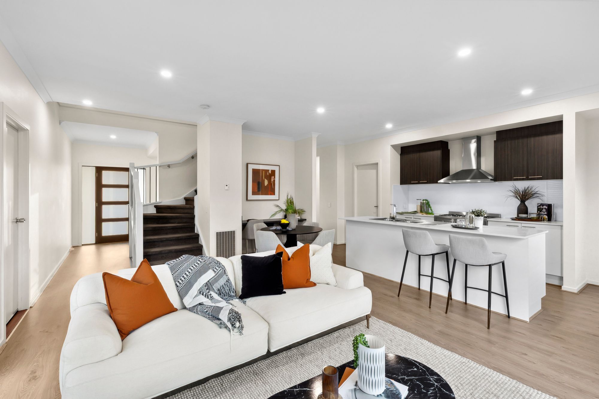 Living: open plan kitchen/ living/ dining, timber laminate flooring, additional study nook and desk area, down lights, roller blinds, glass sliding stacker doors leading to outdoor area creating an indoor/ outdoor flow, split system cooling, ducted heating