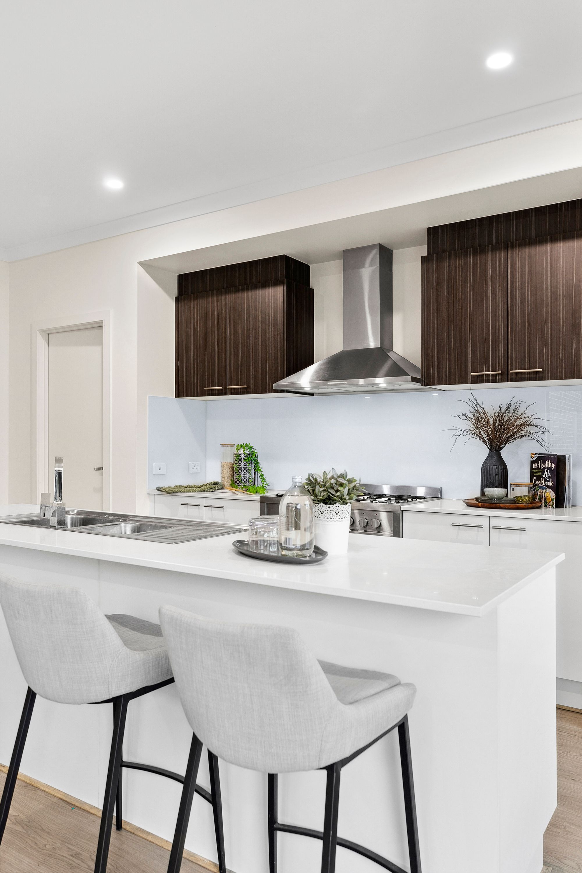 Kitchen: timber laminate flooring, stone bench tops including island bench with overhang for breakfast bar, large stainless double sink, down lights, 900mm stainless steel appliances, dishwasher, glass splash back, a spacious walk in pantry with ample shelving & storage, sleek overhead cabinetry & cupboards throughout, fridge cavity, chrome fittings and fixtures, ducted heating, split system cooling