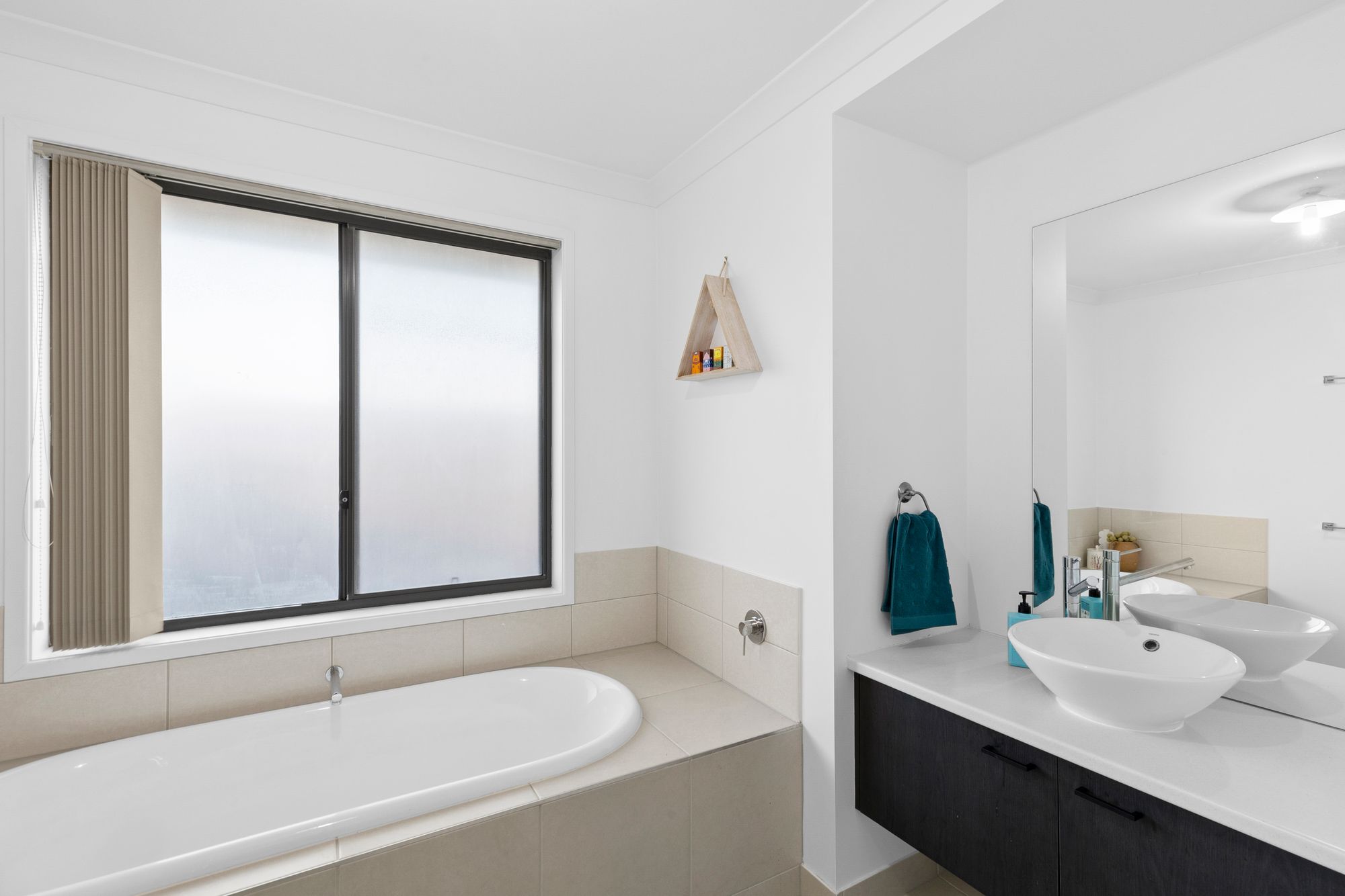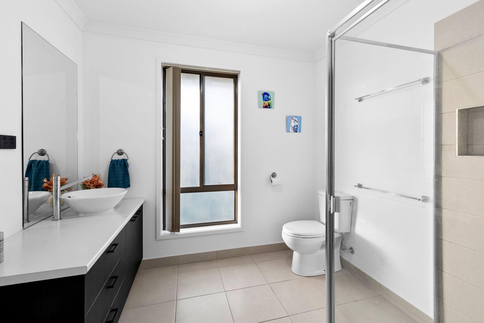 Main Bathroom – Single vanity, shower with feature niche, bath & separate toilet
