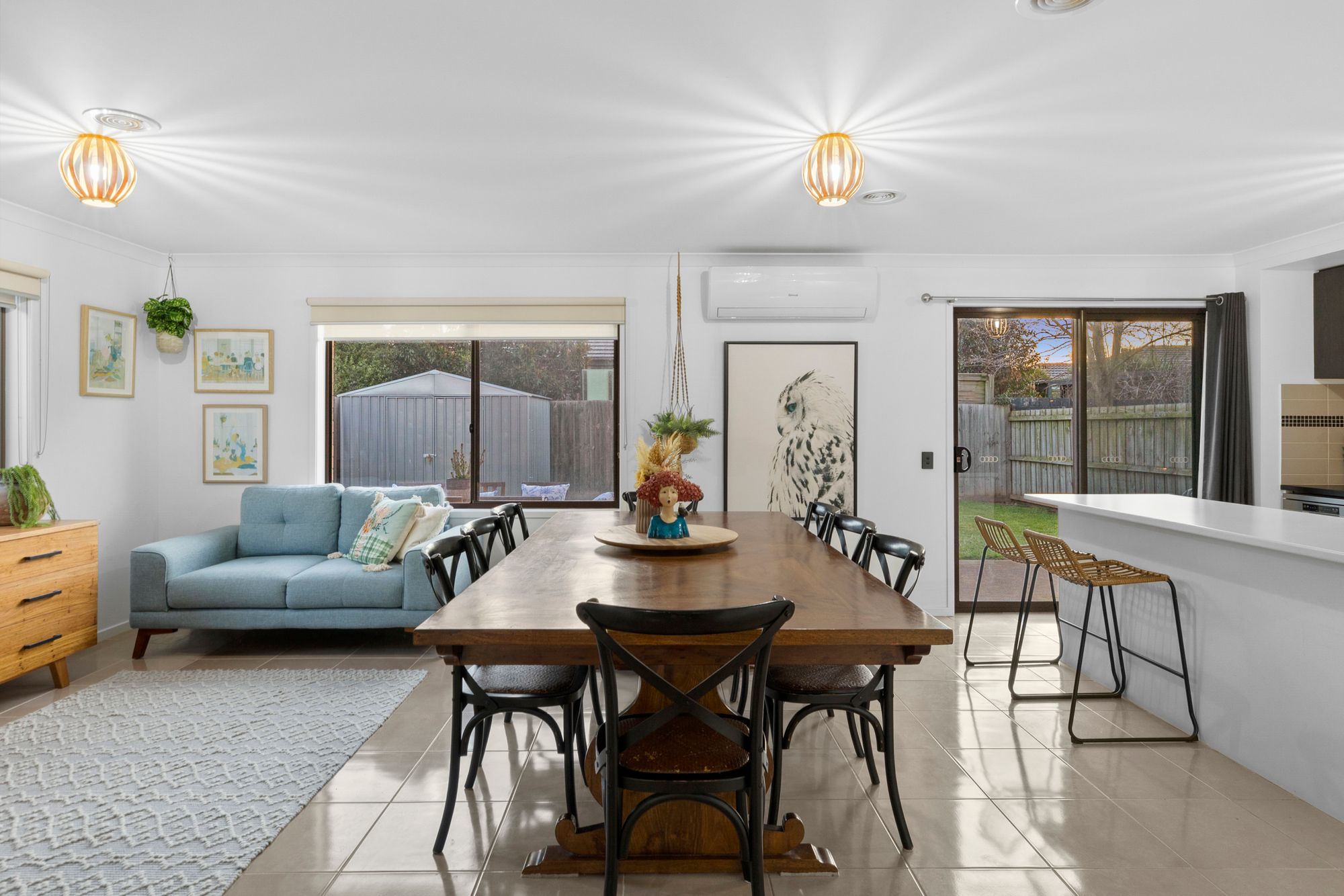 Living – Open plan adjoining living/dining/kitchen, ducted heating, split system cooling, tile flooring, glass sliding doors open onto outdoor concrete pad