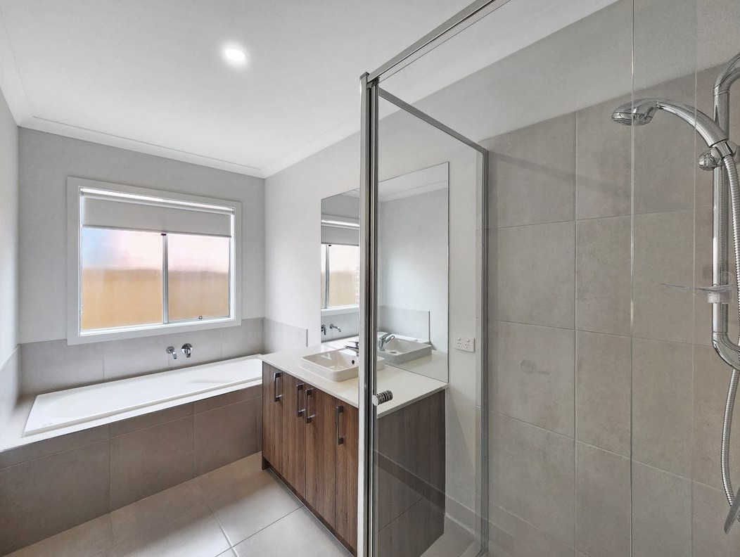 Additional Bathroom: Effortlessly servicing the household and the three bedrooms surrounding, the secondary bathroom homes a single basin on a stone benchtop vanity with a mirrored splashback, tiled semi-frameless shower with handheld showerhead, bathtub, window with blockout blinds, and separate toilet.