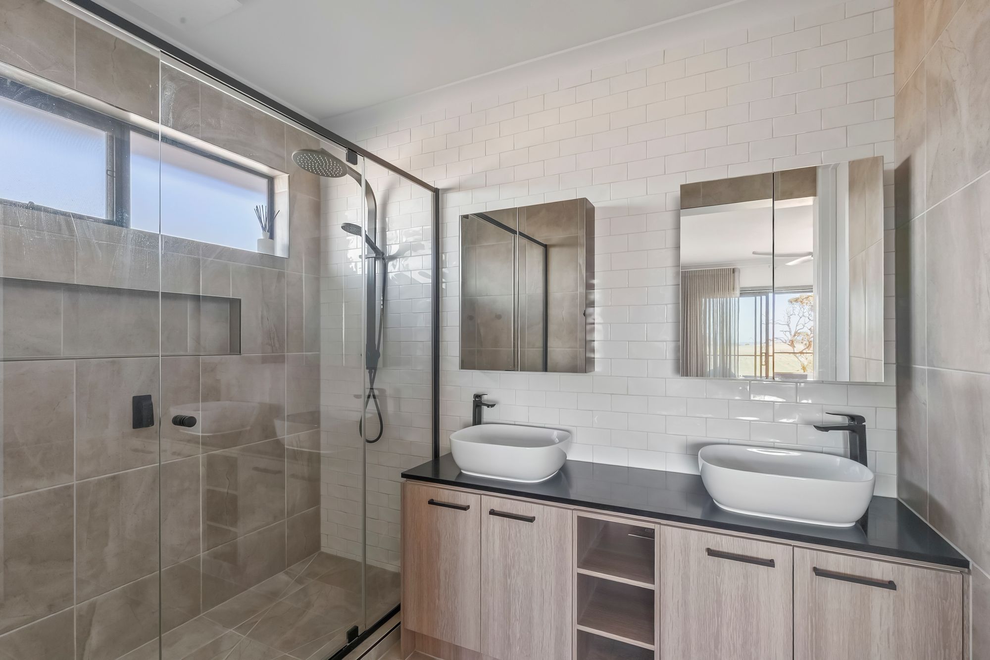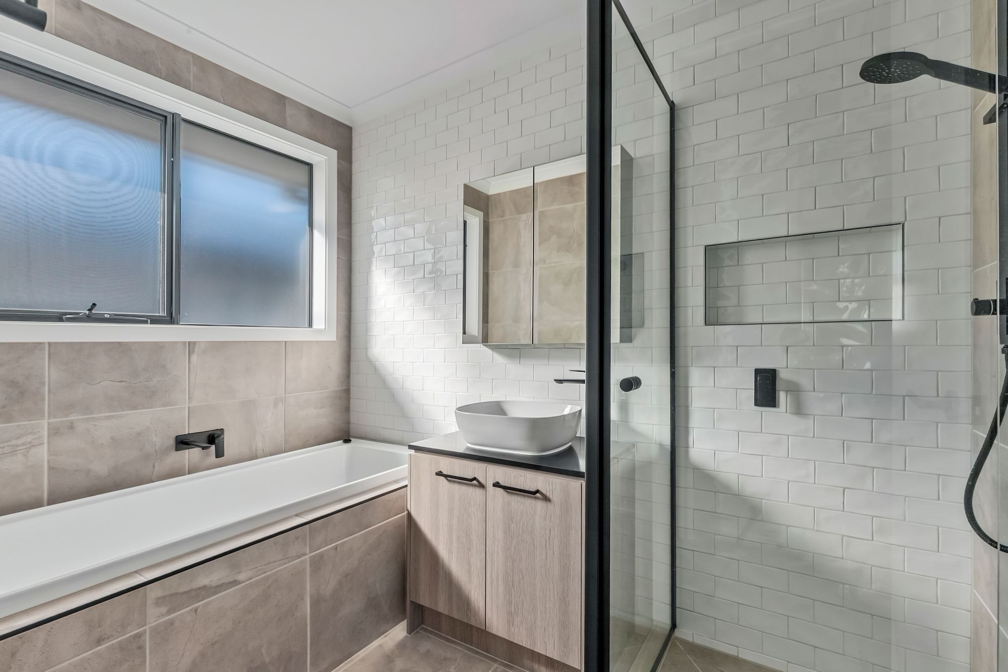 Additional Bathrooms: The bathroom exude a sense of space and sophistication with a sizeable semi-framed shower, raised bath, floor-to-ceiling tiles, 20mm stone benchtops and frosted windows for additional privacy. An additional powder room can be found on the lower floor, a convenience often sought after but not typically found.