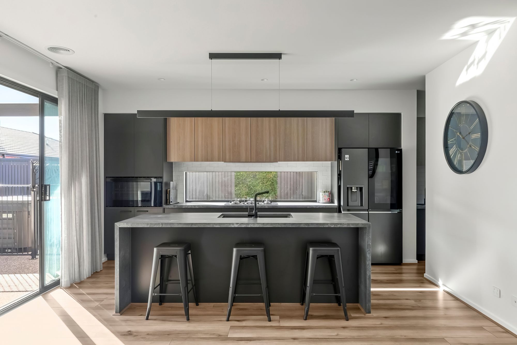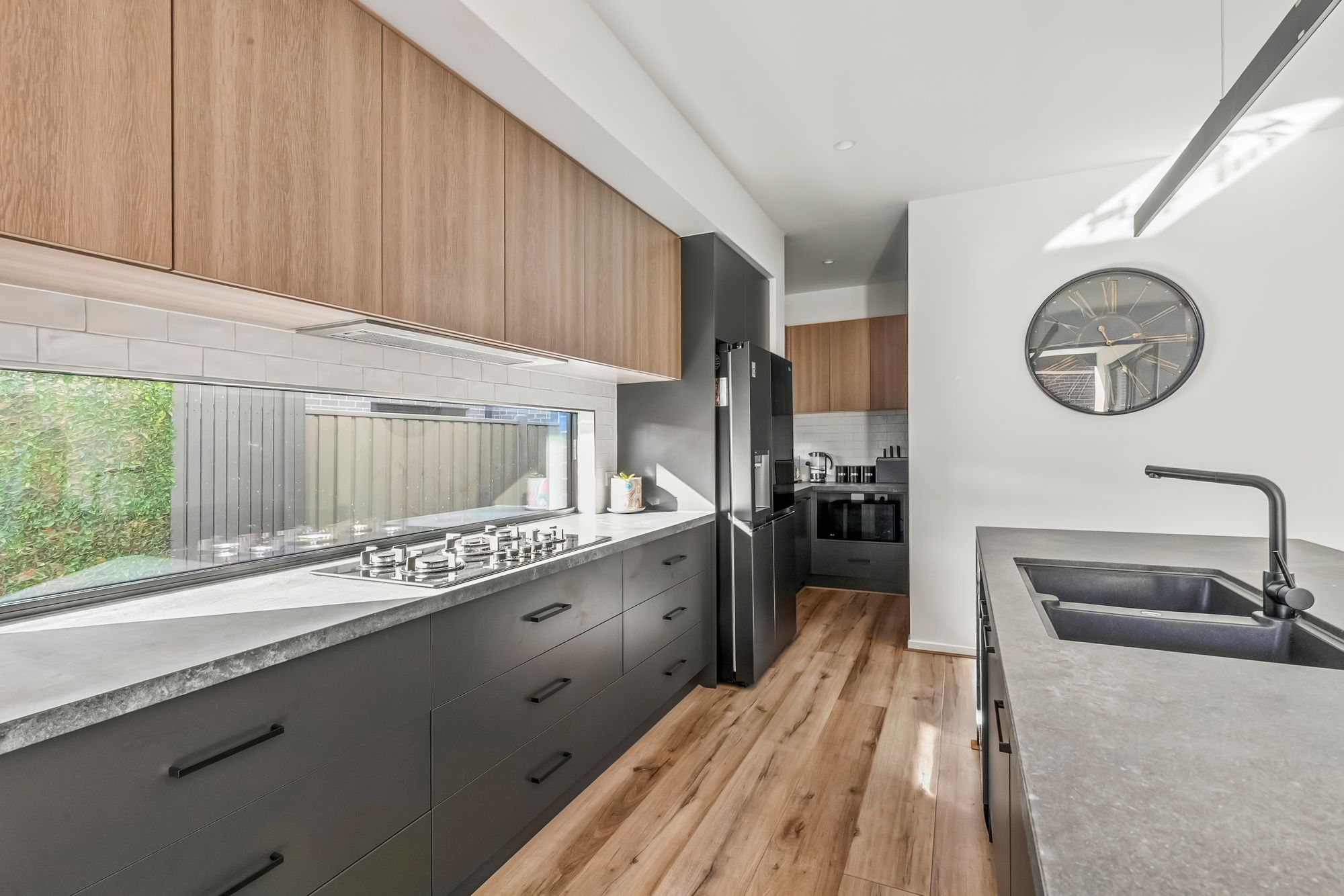 Kitchen: Cook and entertain in style with 40mm waterfall stone benchtops, an integrated oven and stovetop, enclosed rangehood, dual undermount sink and plumbed fridge, all of which are overlooked by a stylish highlight window and accented by elegant bar pendant lighting. The spacious butler’s pantry includes a secondary sink, microwave cavity and ample storage.