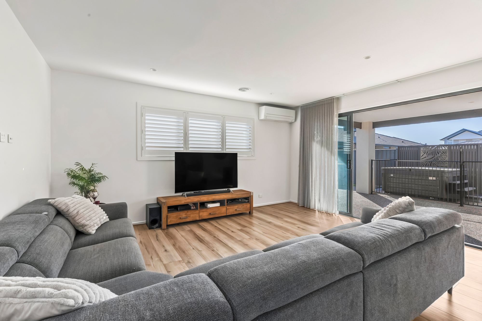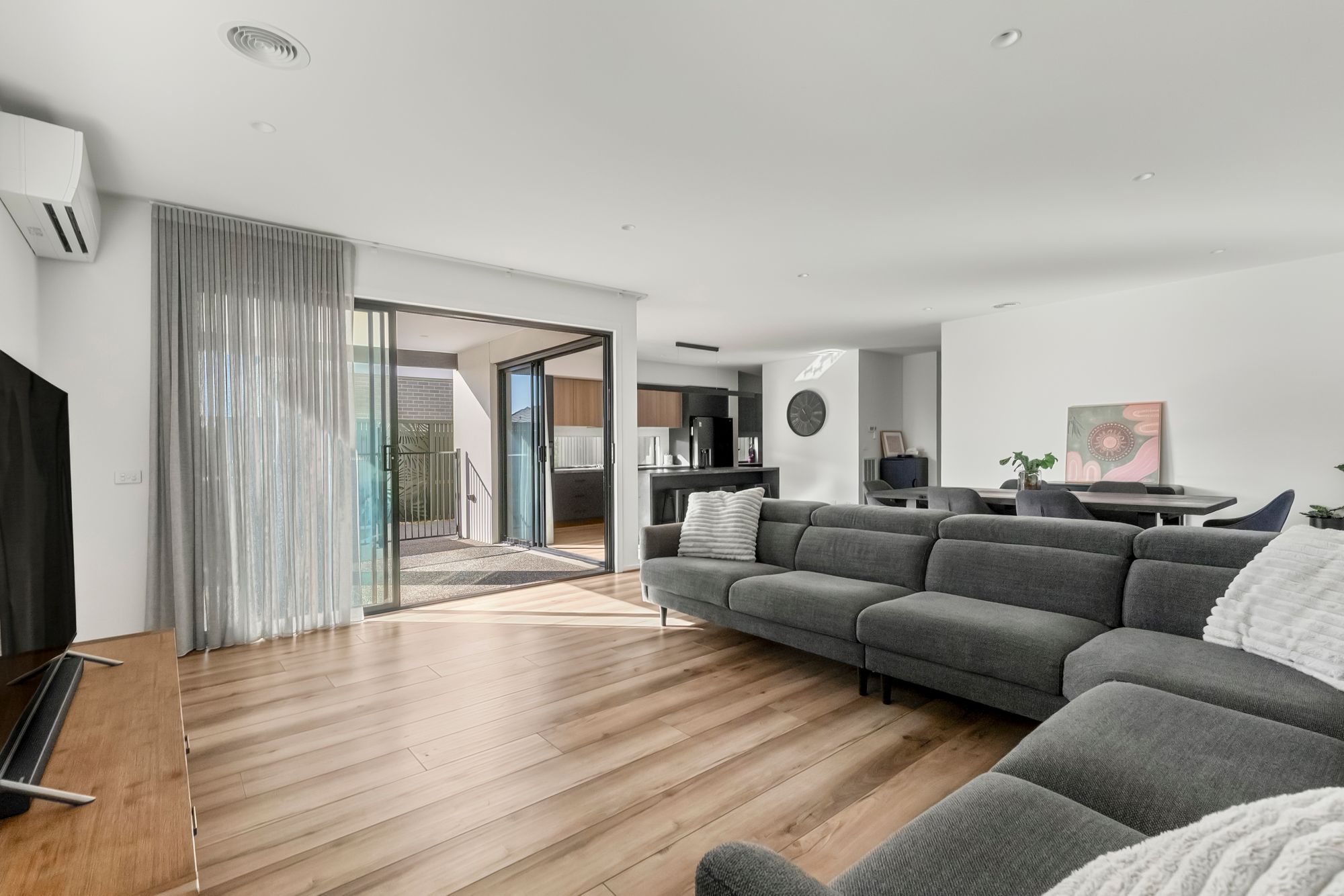 Open Plan Living/Dining: Bright and expansive, this open-plan area features squareset ceilings and downlights. Dual stacking glass sliding doors provide seamless indoor-outdoor flow to the backyard, perfect for entertaining. Ducted heating, split-system cooling, double glazing and sheer curtains.