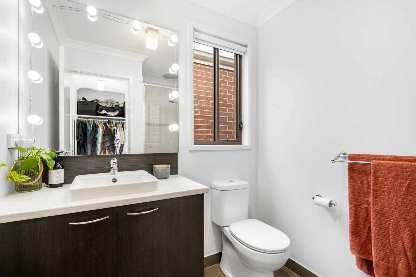 Ensuite: Single shower, vanity with storage underneath, frameless mirror and toilet.
