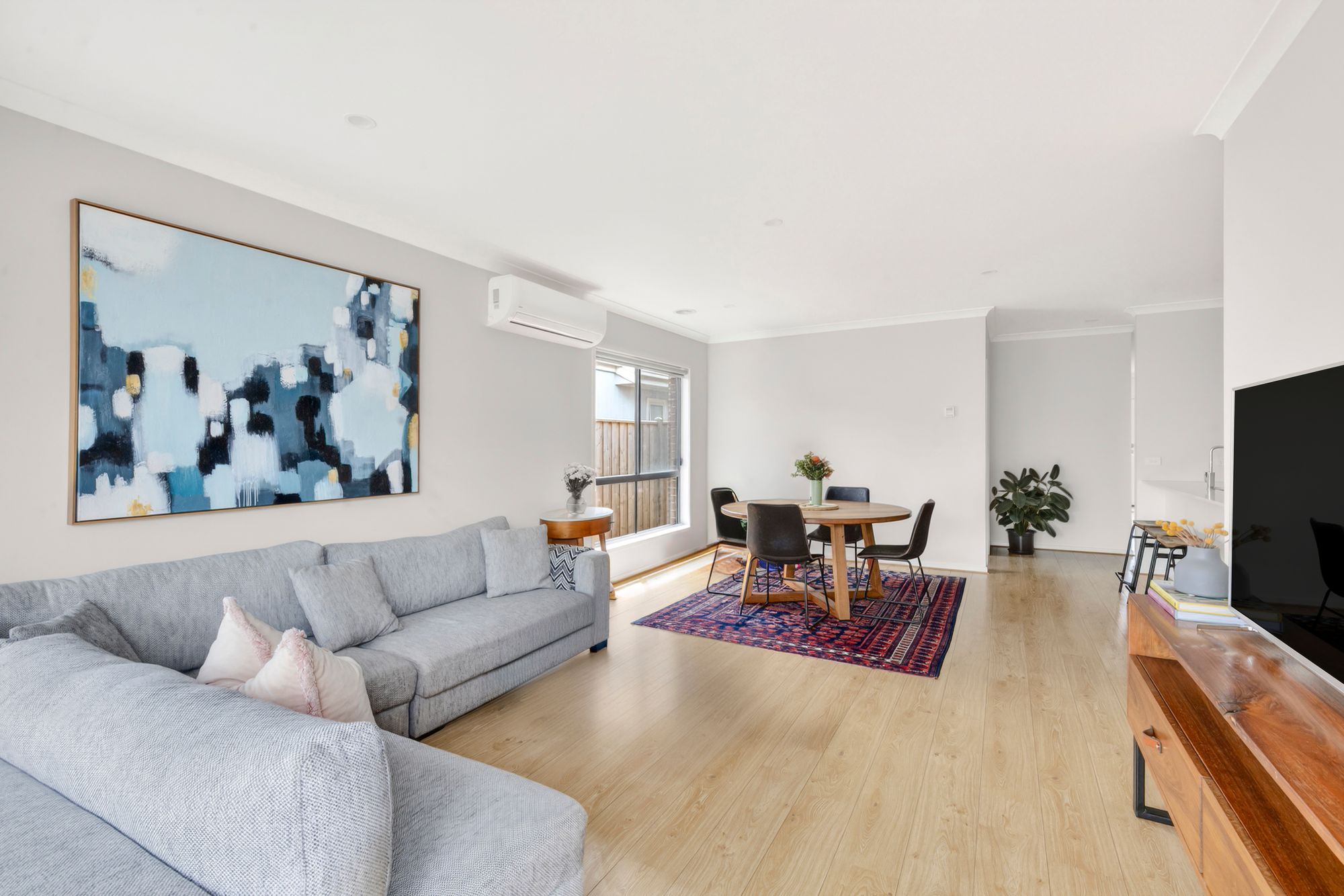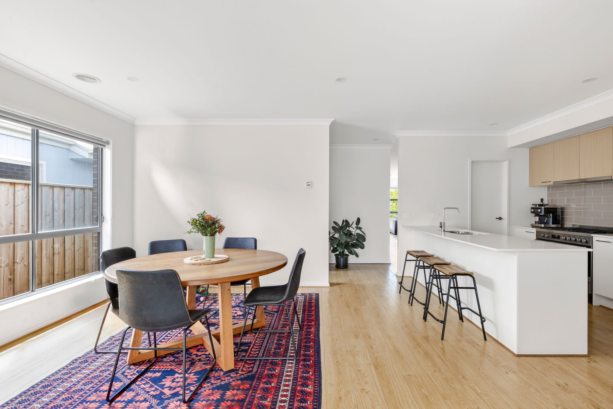 Open Plan Living/Dining: Flowing seamlessly from the kitchen, the open plan living and dining area is flooded with natural light from its desirable North and West facing windows. High ceilings, timber look flooring and downlights create a warm, modern ambience, complemented by ducted heating and split-system cooling for year-round comfort. Wide windows with roller blinds and glass sliding doors connect the interior to the East-facing alfresco and rear yard, delivering the perfect indoor-outdoor lifestyle.