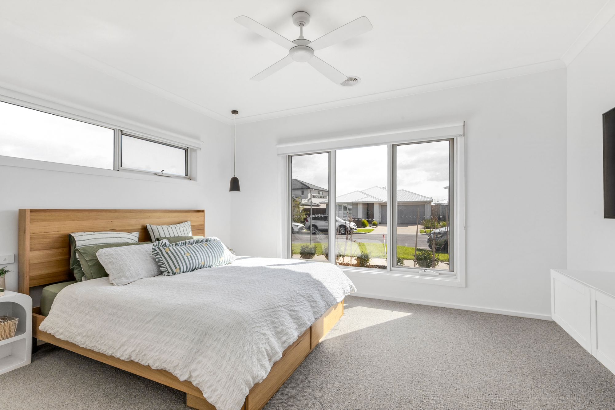 Master Suite: The spacious master suite is a private sanctuary, enhanced by north-facing light, double glazing, soft carpeting, and elegant finishes throughout. It features walk-in robes and built-in cabinetry, while the luxurious ensuite boasts stone benchtops, upgraded cabinetry, a backlit smart mirror, and a large walk-in shower with premium fittings and tiling. Additional comforts include a ceiling fan, pendant lighting, and ducted heating.