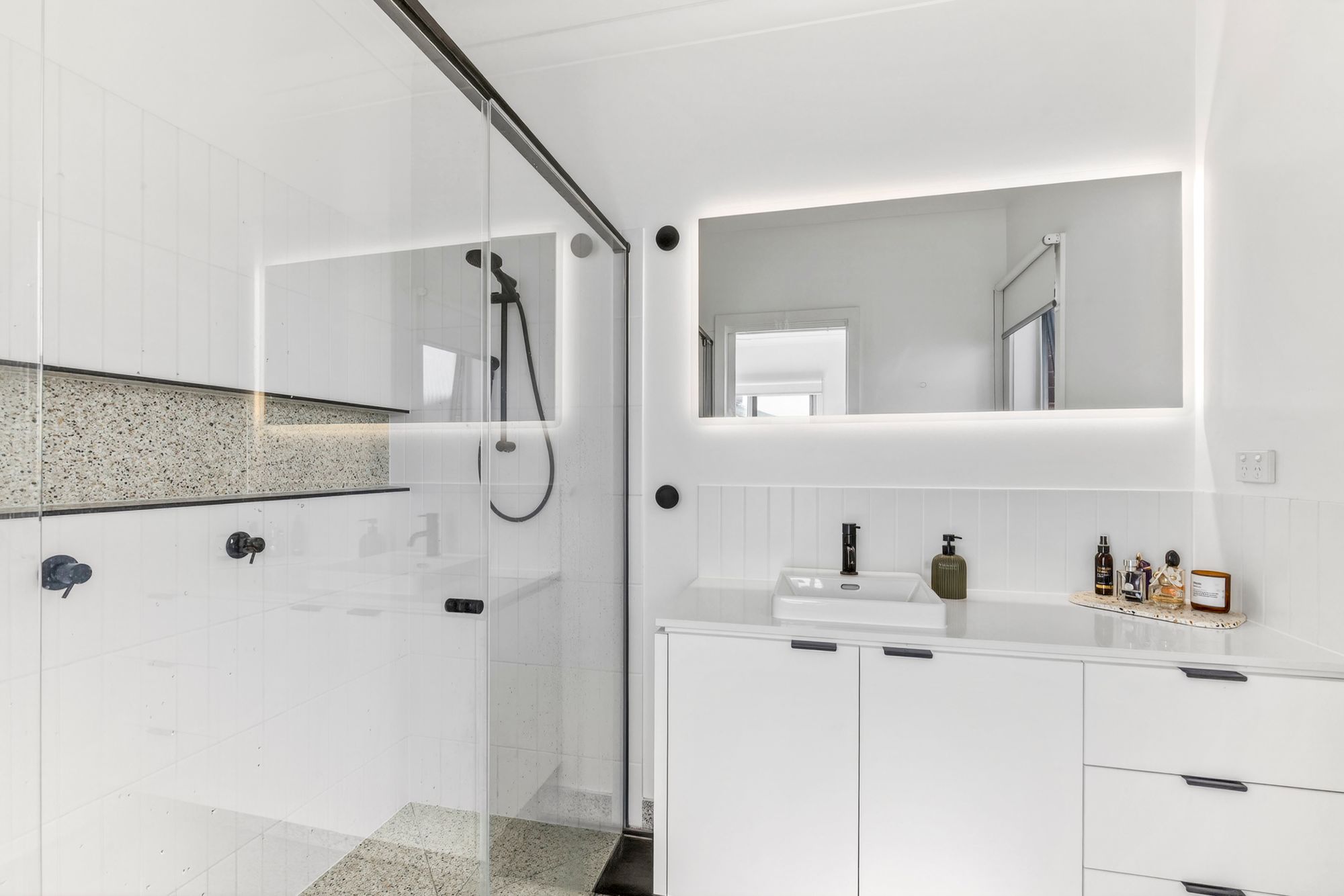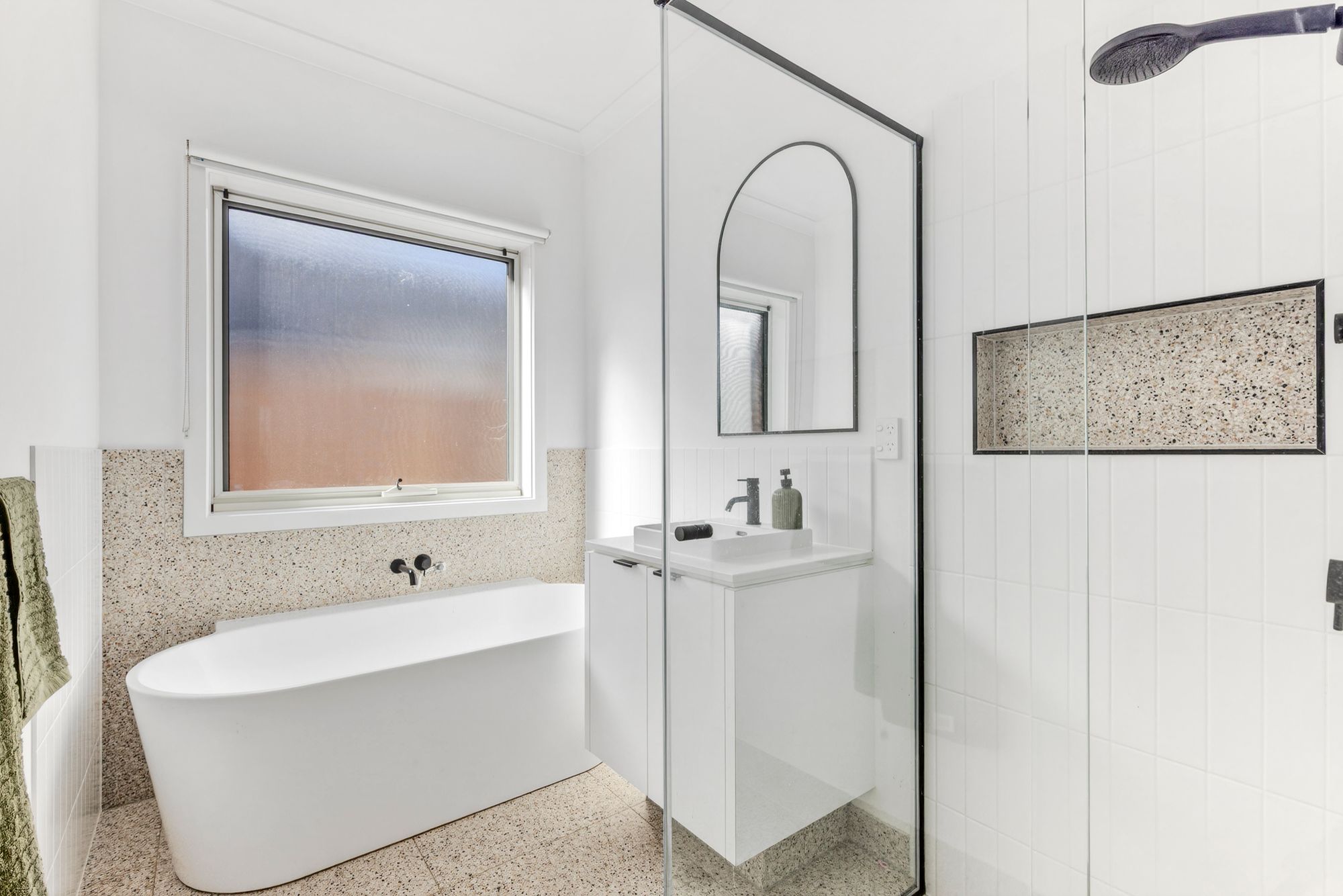 Additional Bathrooms: The main bathroom is beautifully appointed with a stone benchtop vanity, quality cabinetry, and a stylish freestanding bath. A semi-frameless shower with feature tiling, niche, arch mirror, and frosted window enhance the modern aesthetic, while a separate toilet adds everyday convenience.