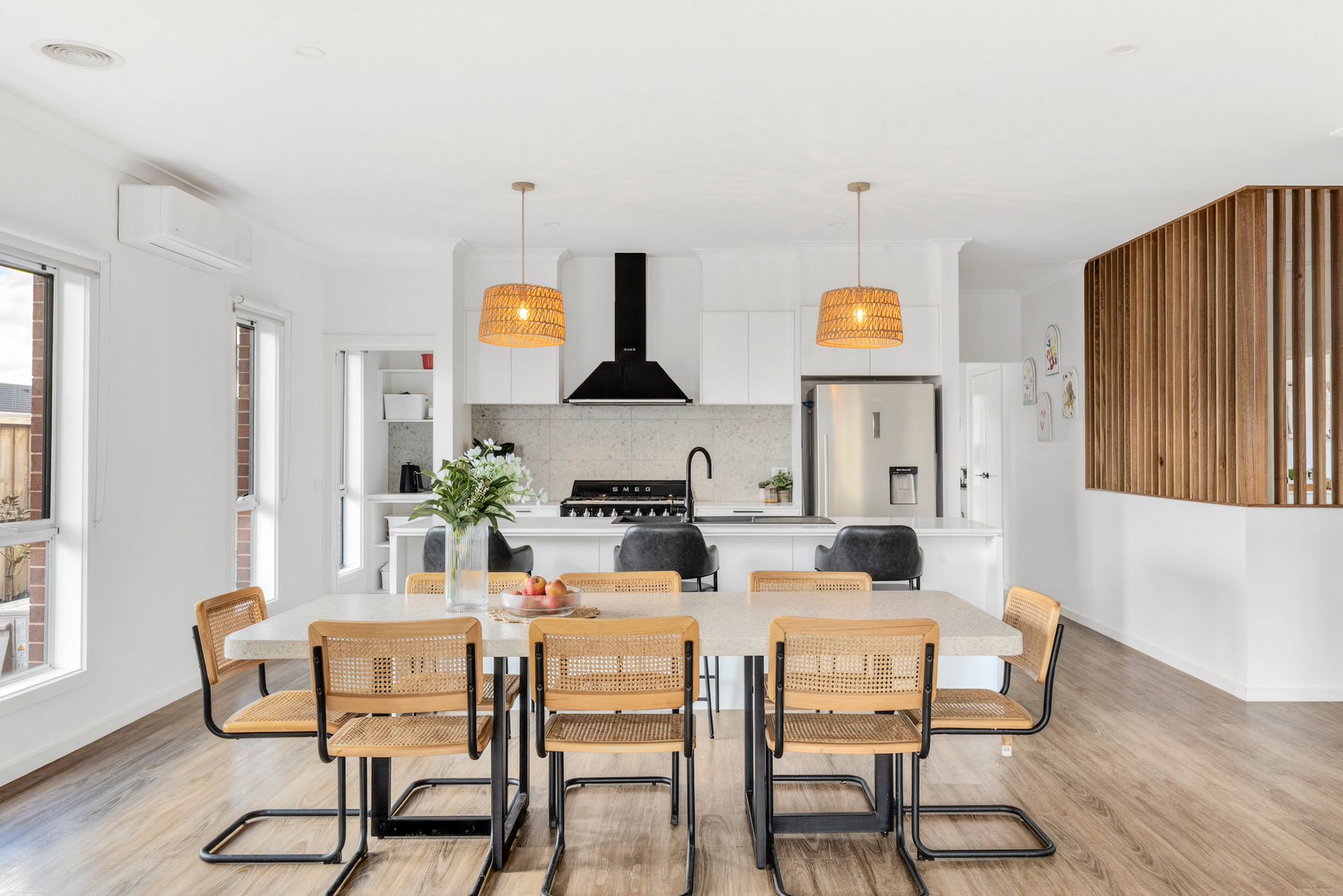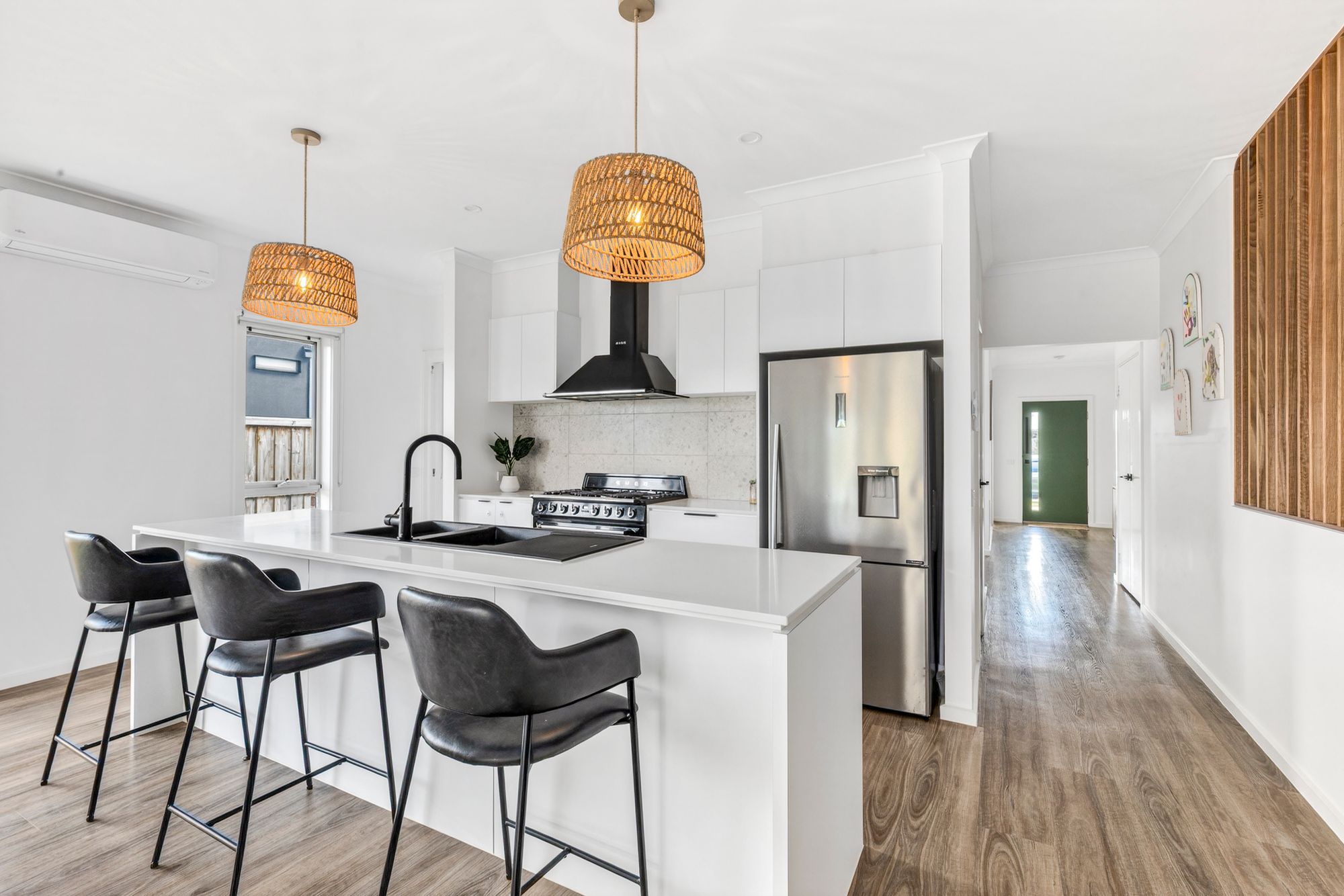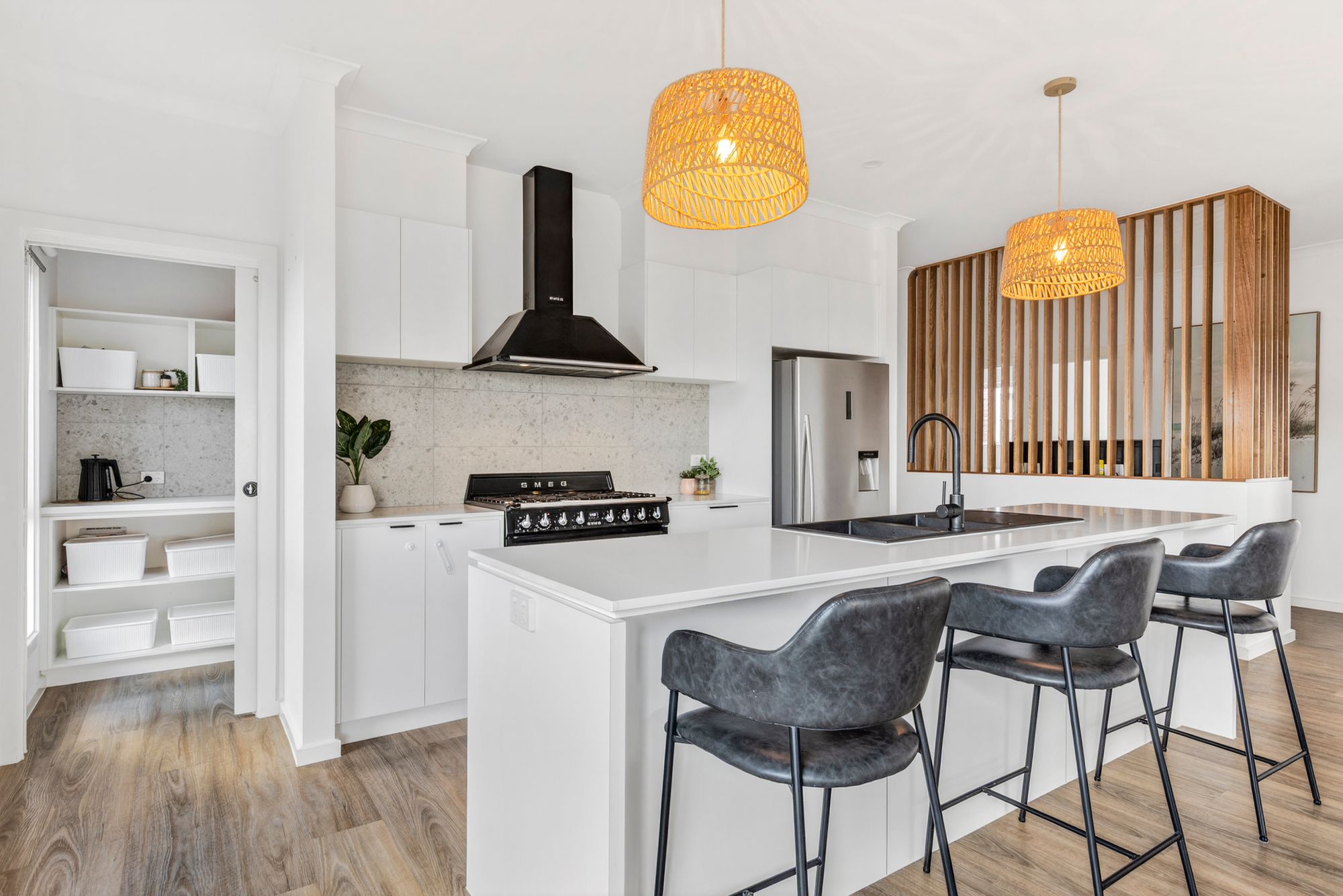 Kitchen: The standout centrepiece of the home. The kitchen combines style and functionality with 20mm stone benchtops, a breakfast bar, and feature splashback. Equipped with premium Smeg appliances and a Fisher & Paykel dishwasher, it also offers a fully appointed butler’s pantry, upgraded cabinetry, and a large fridge cavity with water point. High ceilings, hybrid flooring, black accents, and a combination of pendant and downlighting enhance the space, while double glazing and climate control ensure year-round comfort.