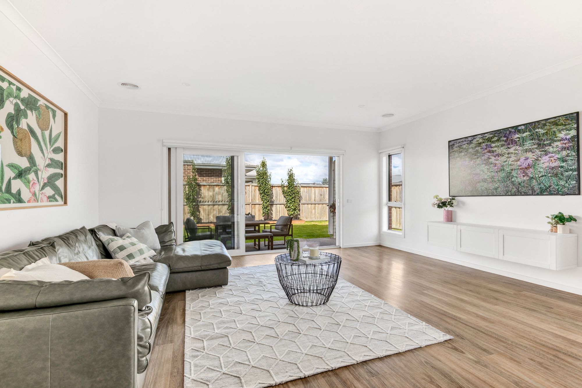 Open Plan Living/Dining: The open plan living and dining area is designed for effortless everyday living, featuring high ceilings, double glazing, hybrid flooring, and an abundance of natural light from west-facing windows. Built-in cabinetry and a cleverly concealed study nook add functionality, while stacking glass doors seamlessly connect the interior to the alfresco and backyard. Ducted heating and split-system cooling provide comfort in all seasons.