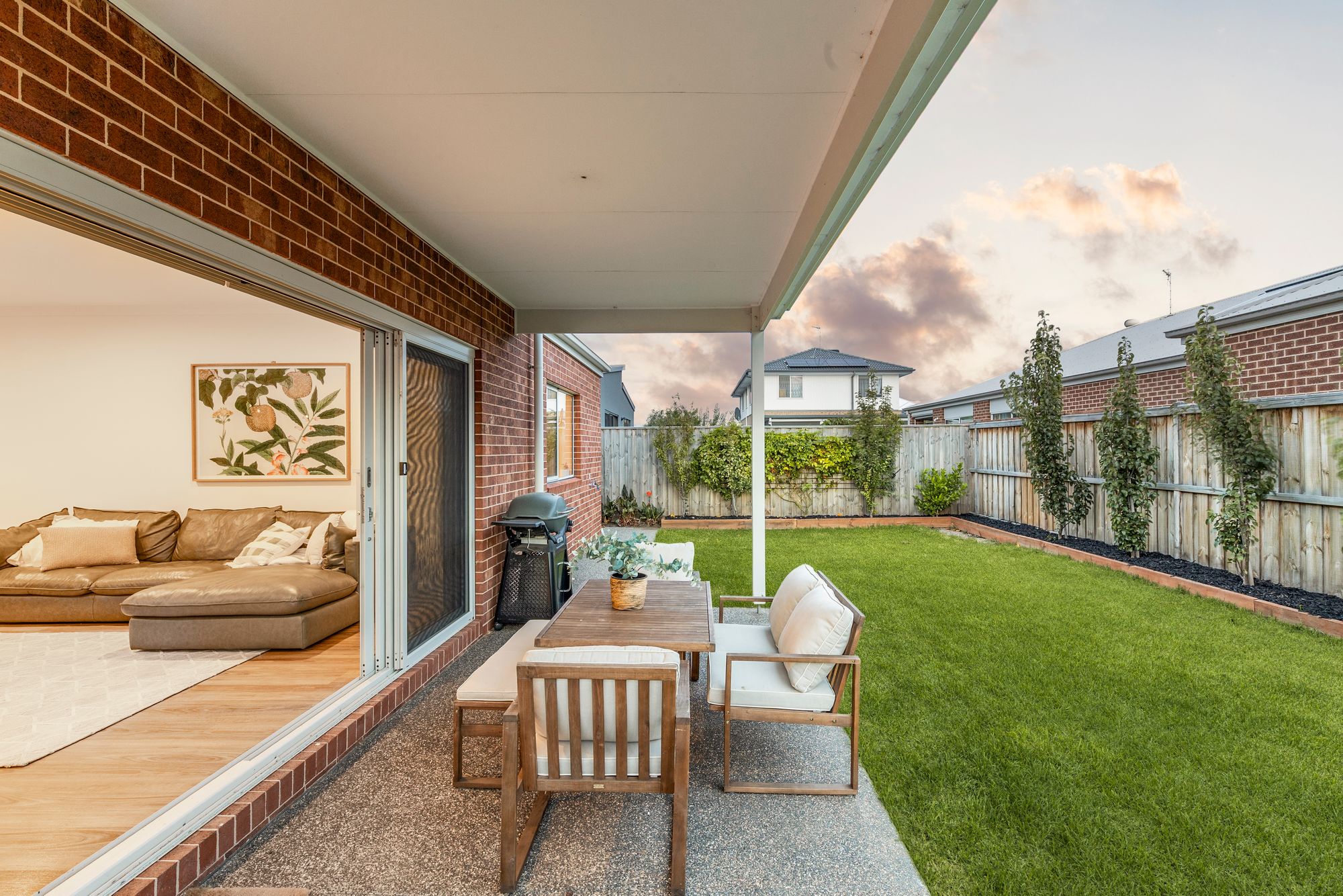 Outdoor: The home presents an impressive street presence with a high-end façade, landscaped gardens, lush lawns, and established planting. An exposed aggregate driveway and pathways complement the North facing frontage, while gated side access and a Colorbond roof complete the exterior appeal. The expansive South-West facing backyard is perfect for families and entertaining, featuring a covered alfresco area, lush lawn, and established gardens. Practical additions include concrete pathways, a designated bin storage area, and convenient rear access from the garage.