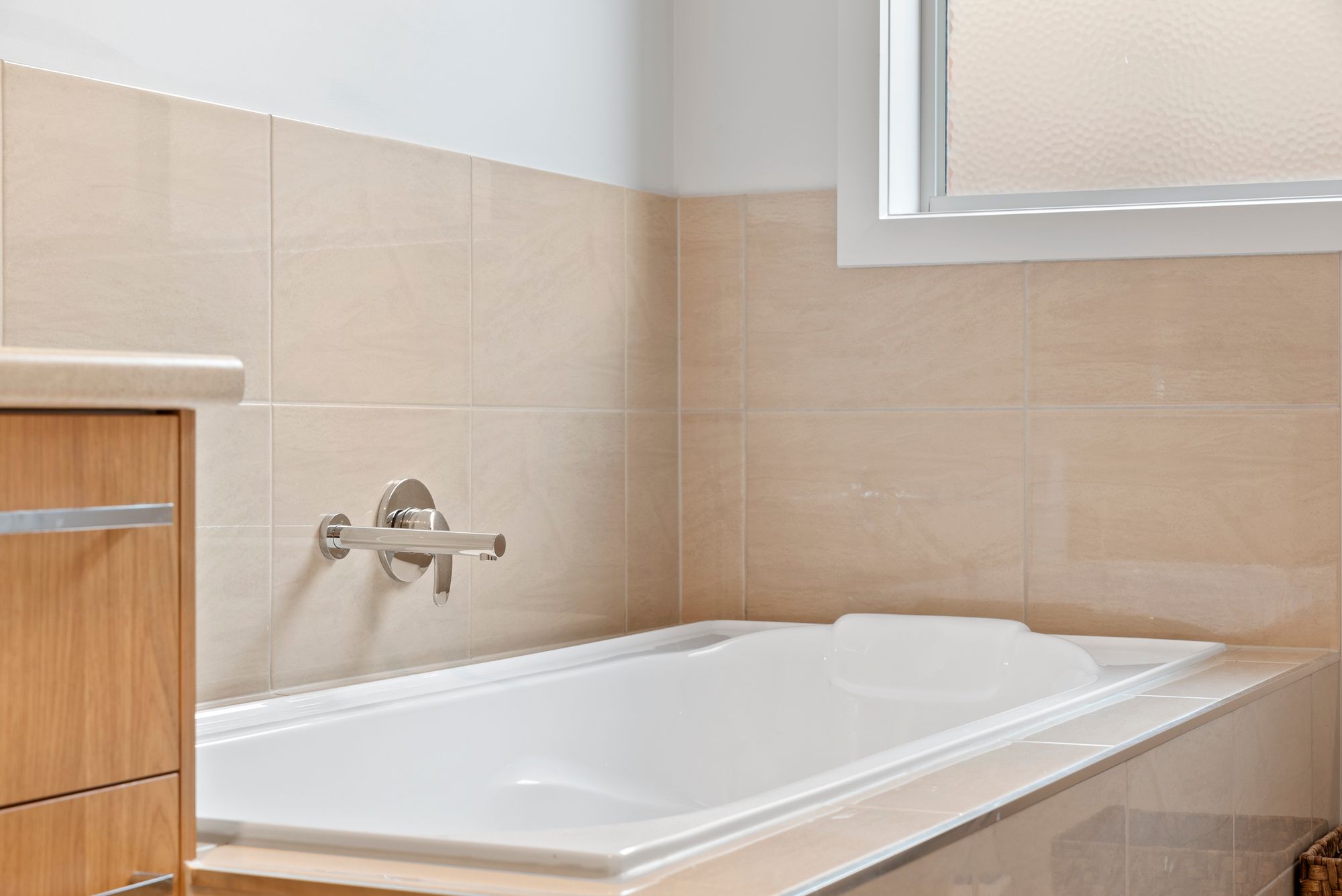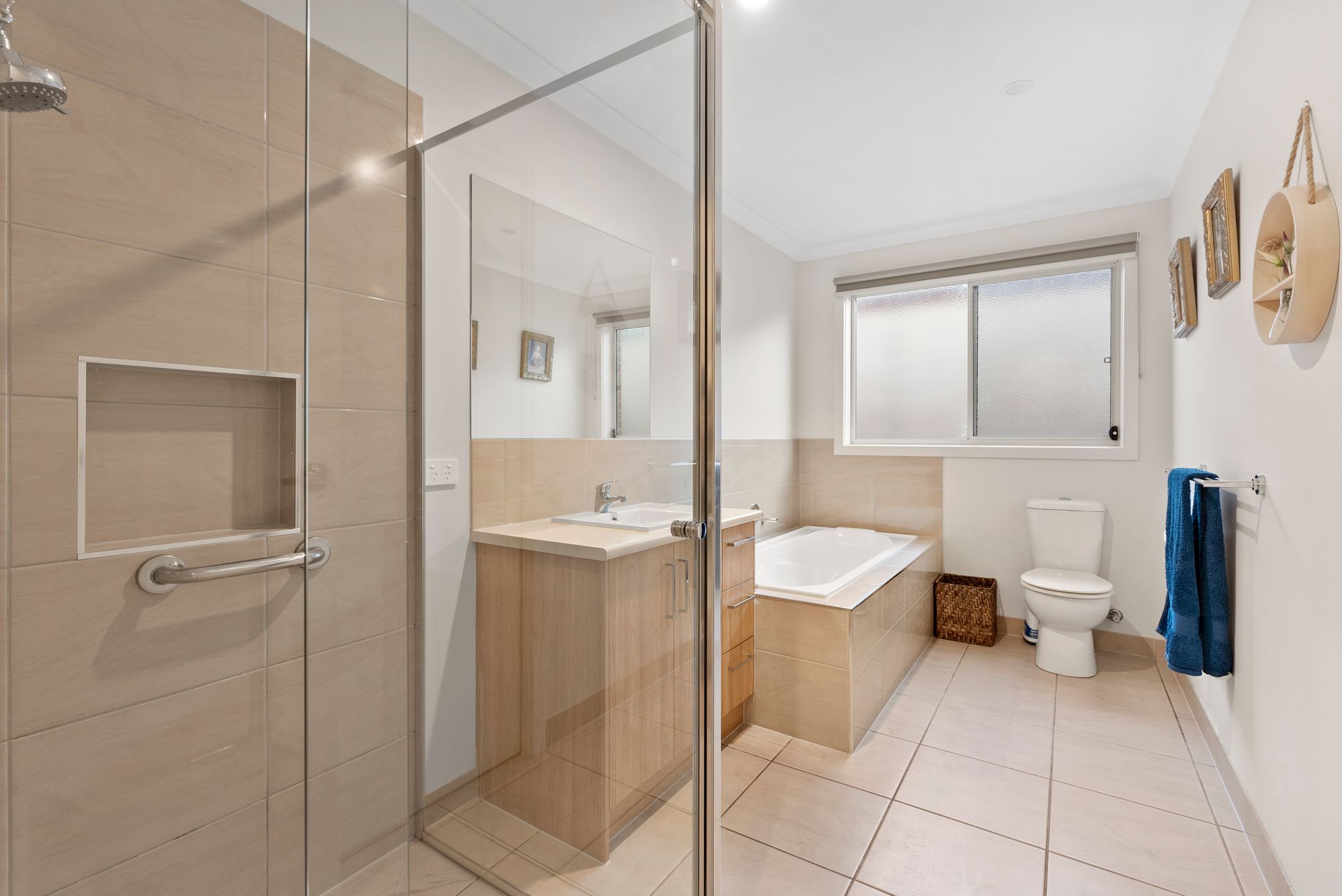 Main bathroom: Tiles, single basin and single vanity, semi frameless shower, bath, toilet, mirror splash back, frosted horizontal window.