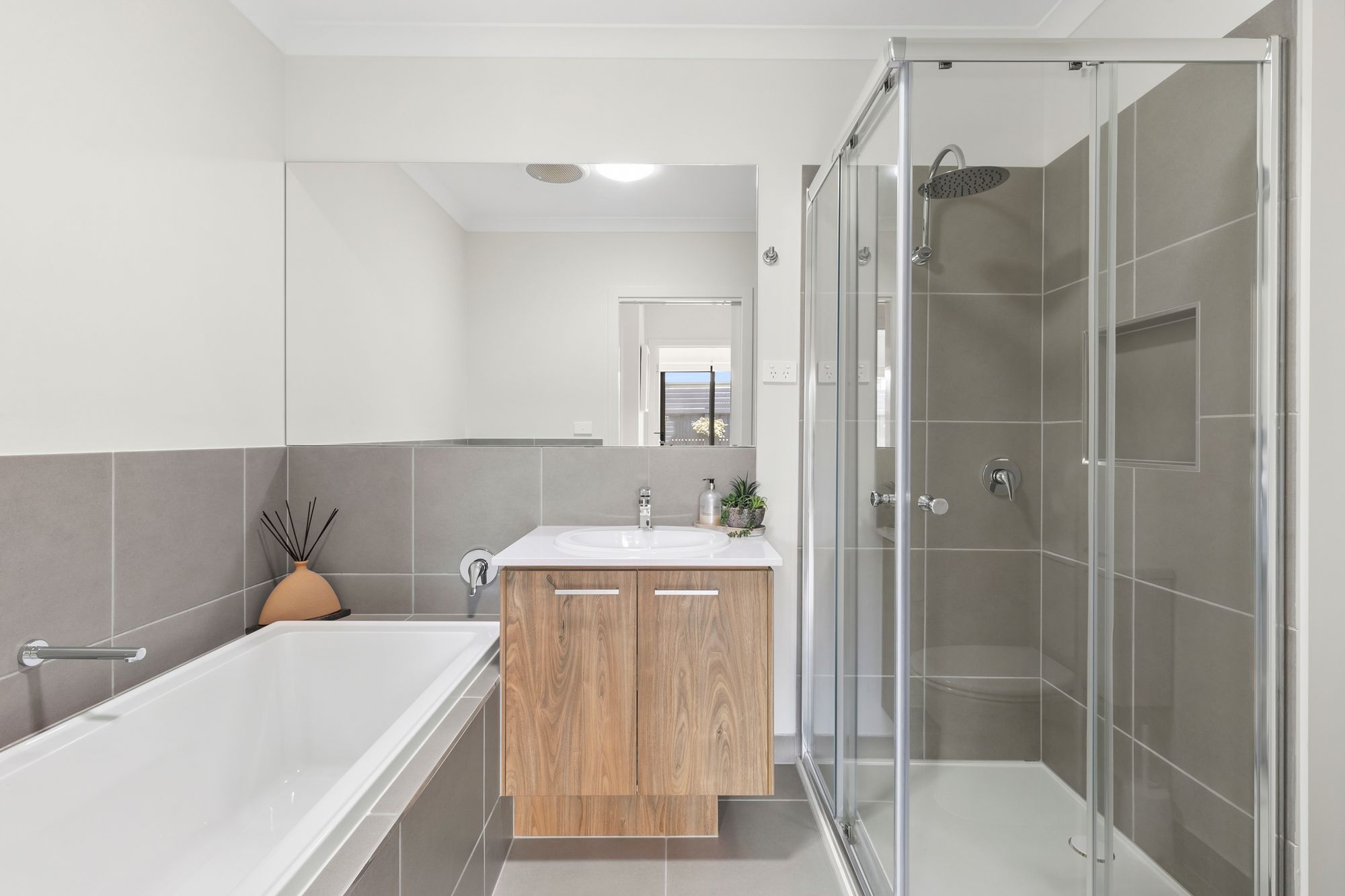 Main bathroom: Bath, semi frameless shower with niche, stone benchtop vanity with basin & large mirror splashback, chrome fittings & toilet.