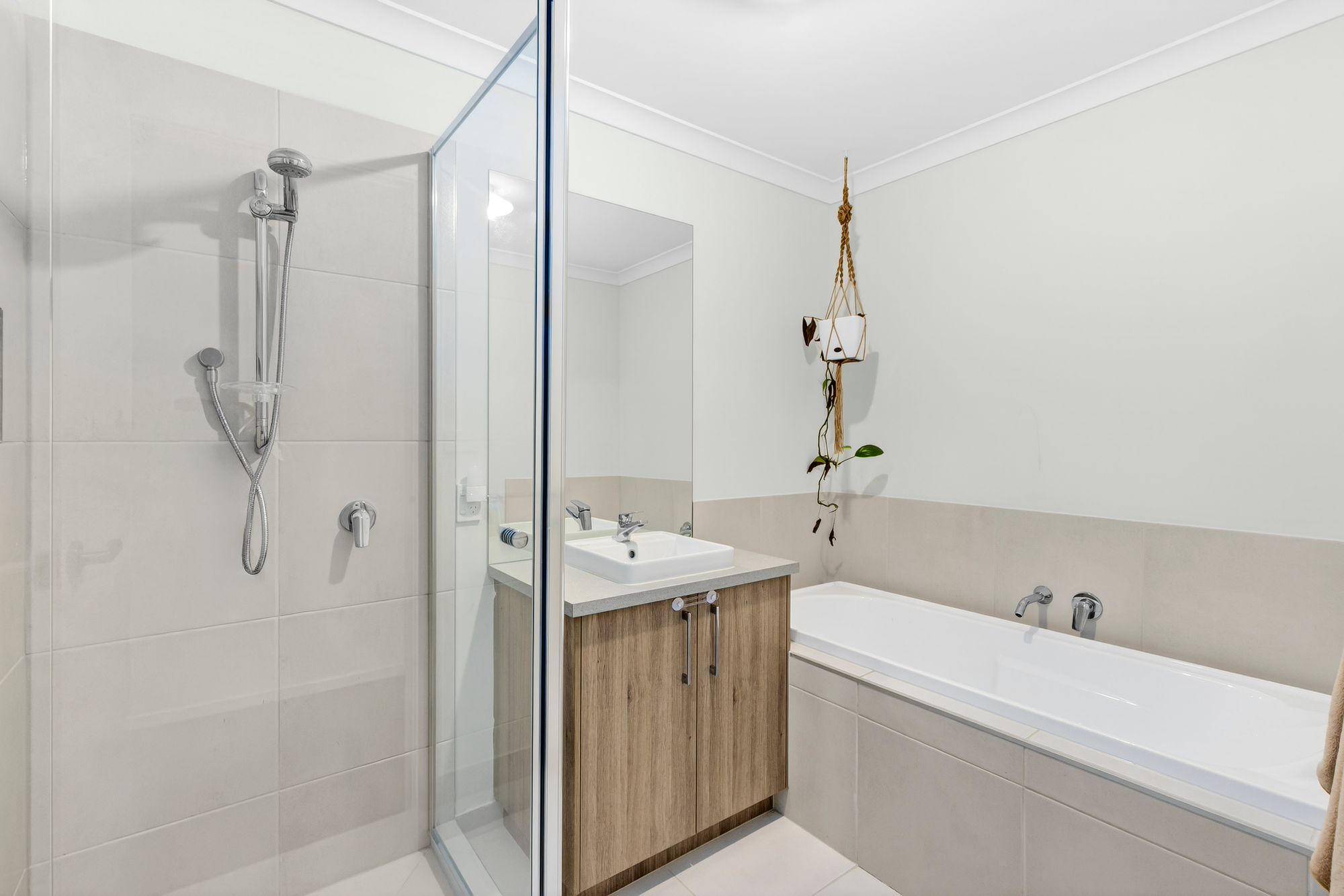 Main Bathroom: 20mm stone benchtop, semi frameless shower, shower niche, tiled shower base, black accents and tapware, bath, single vanity with ample storage, separate toilet.