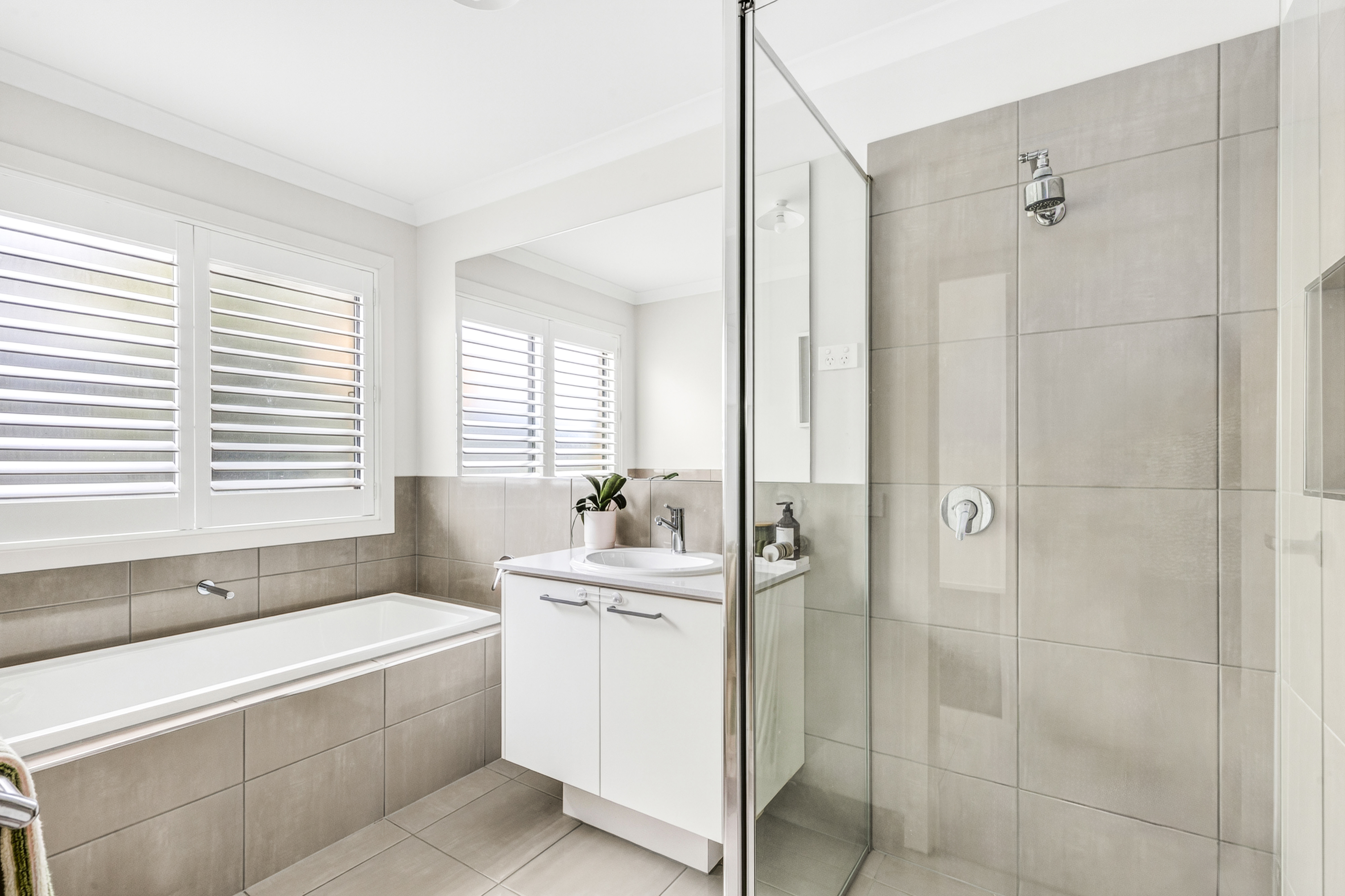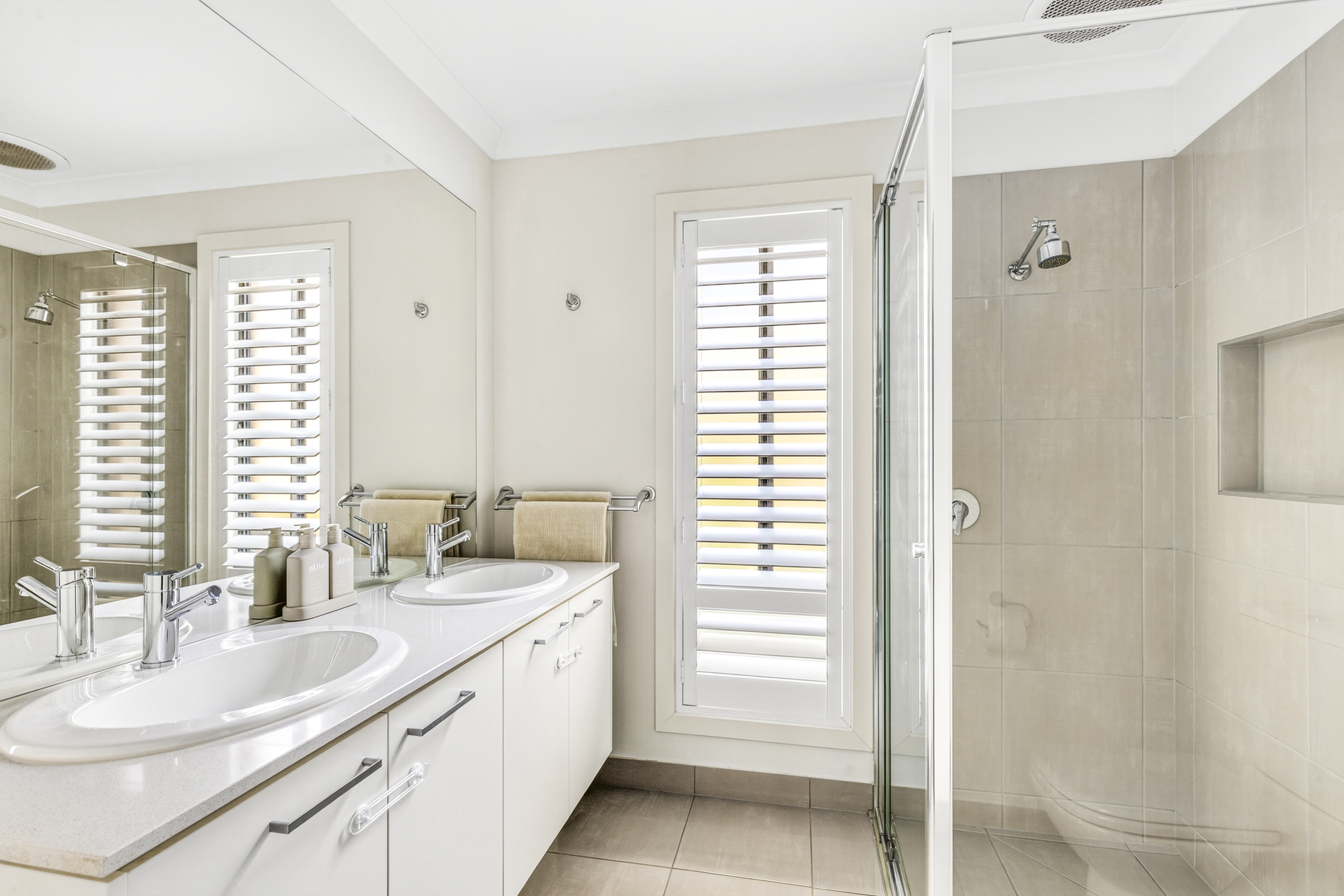 Ensuite; Semi-frameless shower, stone benchtop, large shower niche, large mirror splash back, double vanity with ample storage, chrome fittings, toilet.