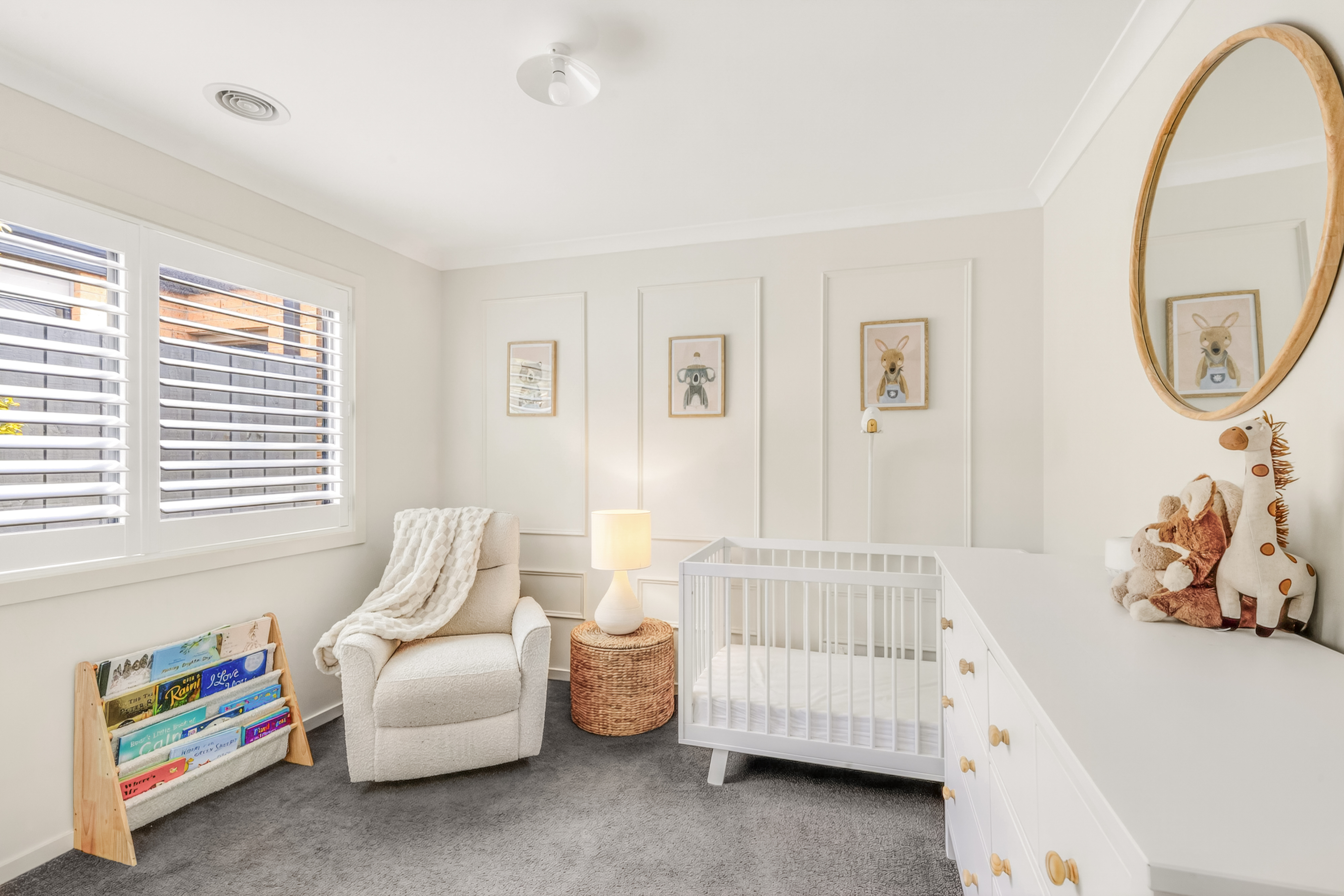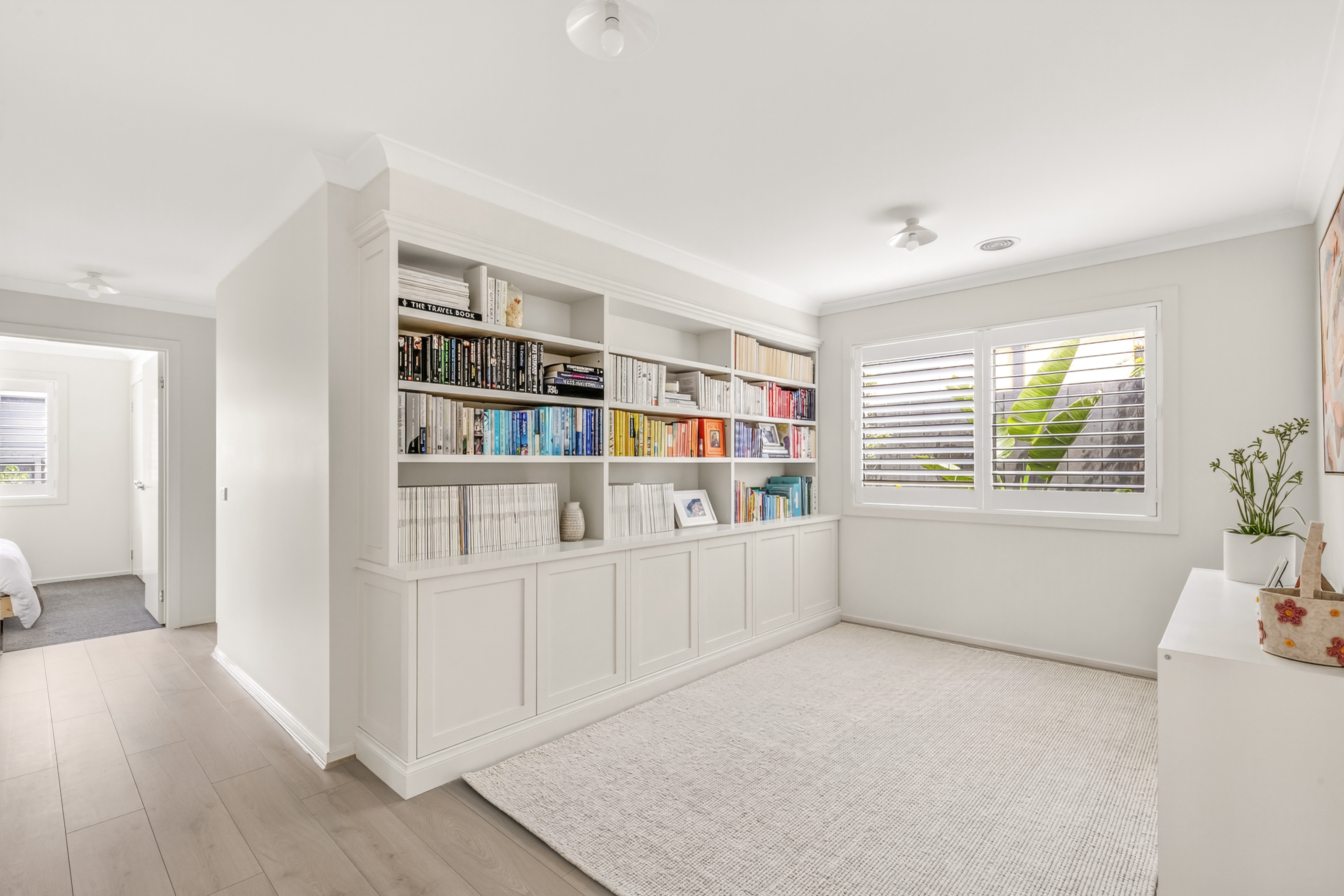 Second Living: High Ceilings, large built in feature book shelf with custom cabinetry designed and installed by local Geelong business SCLK, plantation shutters, ducted heating, evaporative cooling.
