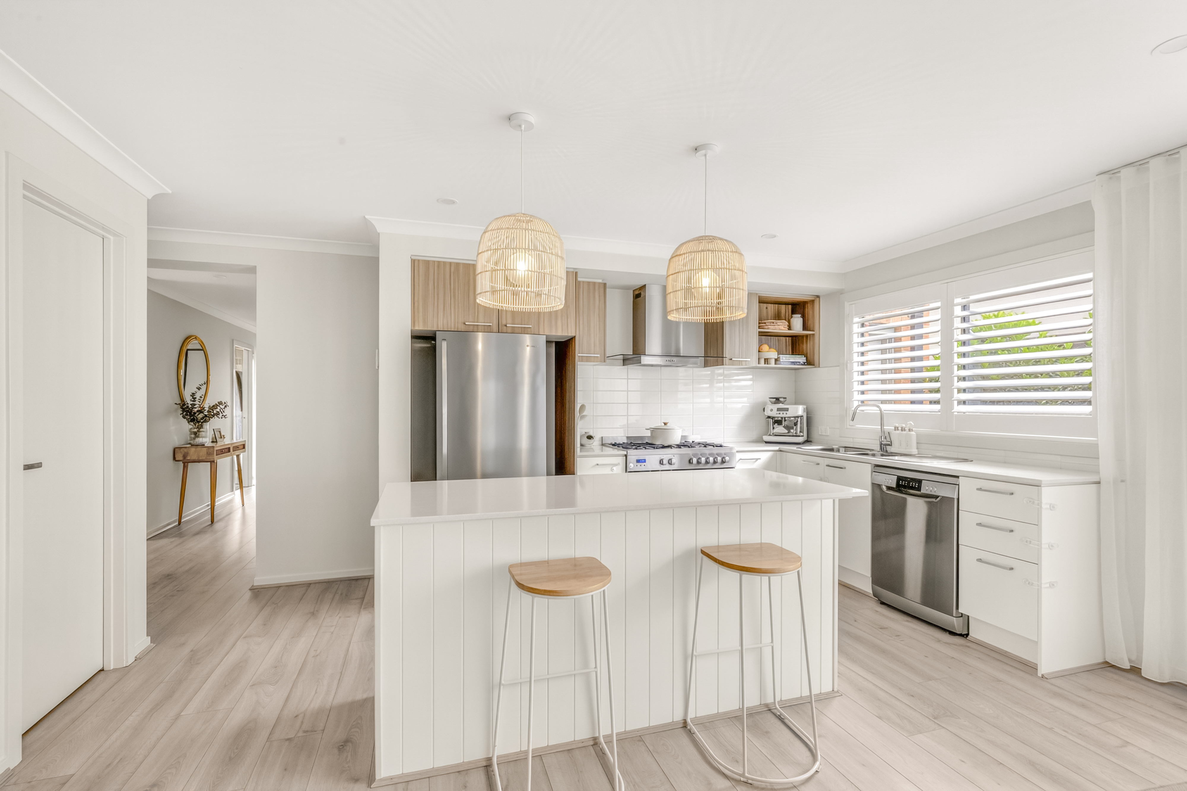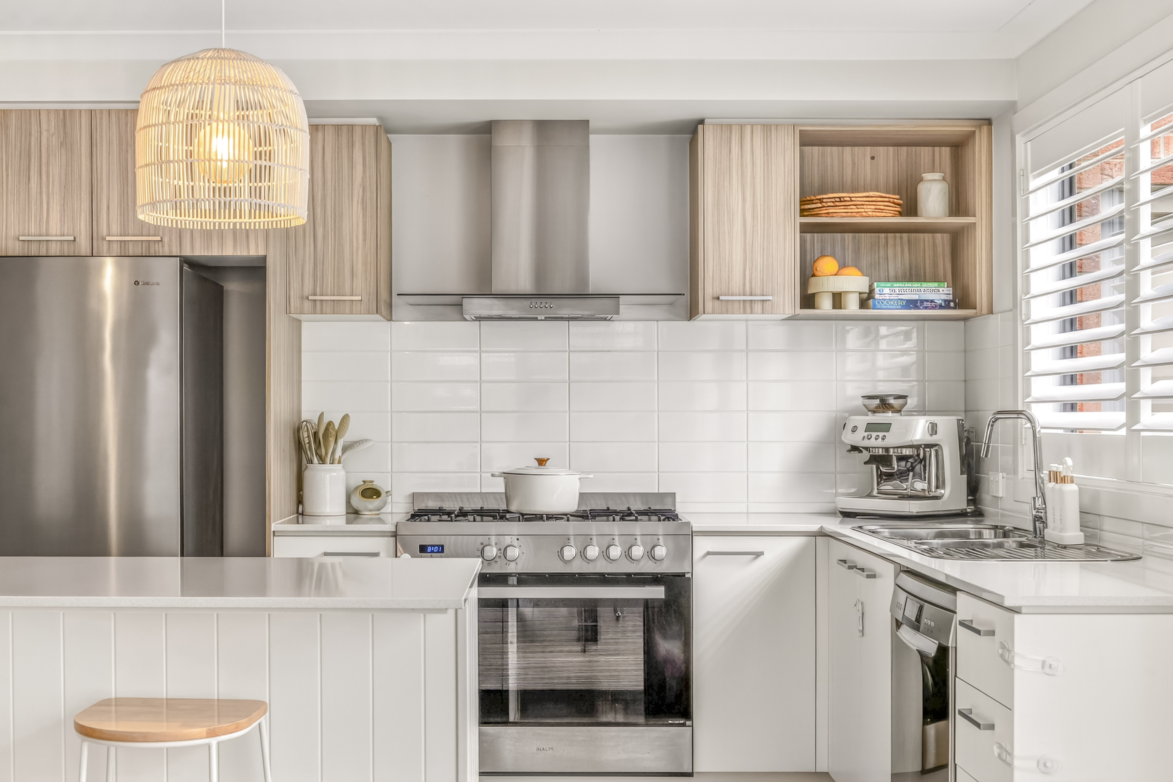 Kitchen: 20mm stone benchtops, wide island bench breakfast bar with overhang and VJ panelling, 900mm gas cooktop & rangehood, overhead cabinetry, feature subway tile splashback, double sink, chrome fittings, dishwasher, downlights, pendent lights, plantation shutters, walk in pantry with shelving.