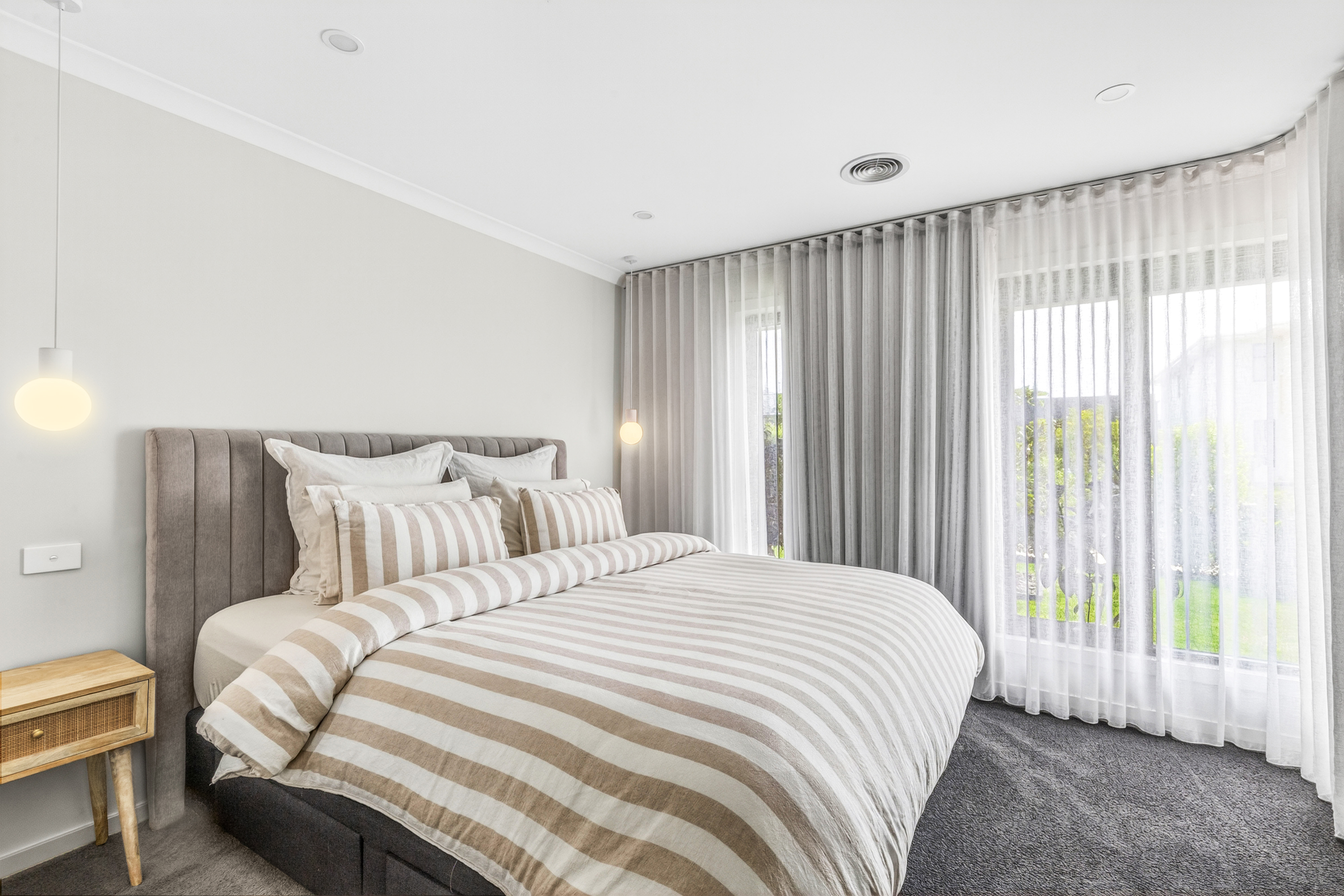 Master bedroom: High Ceilings, carpet flooring, ducted heating, pendant lighting, sheer curtains and roller blinds designed and installed by 3228 Blinds, walk in robe
