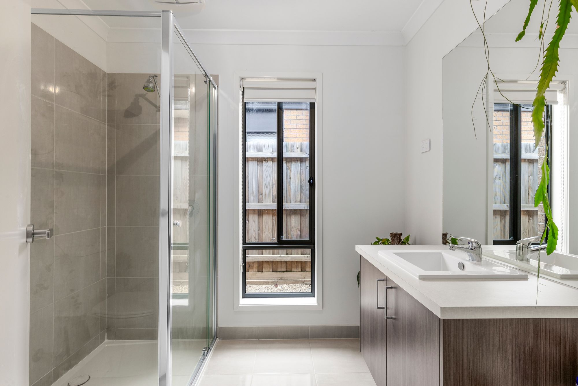Ensuite: Single vanity with ample storage, semi-frameless shower, mirror, chrome fittings, open toilet.