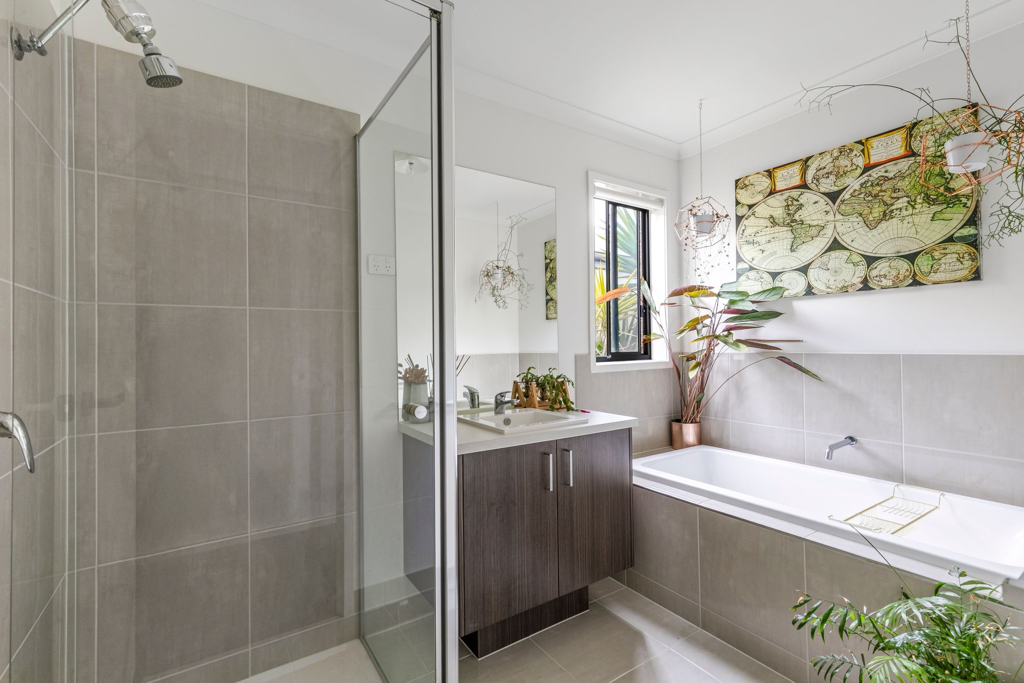Main Bathroom: Semi-frameless shower, single vanity with storage, bath, chrome fittings, towel rail, mirror, power outlets.