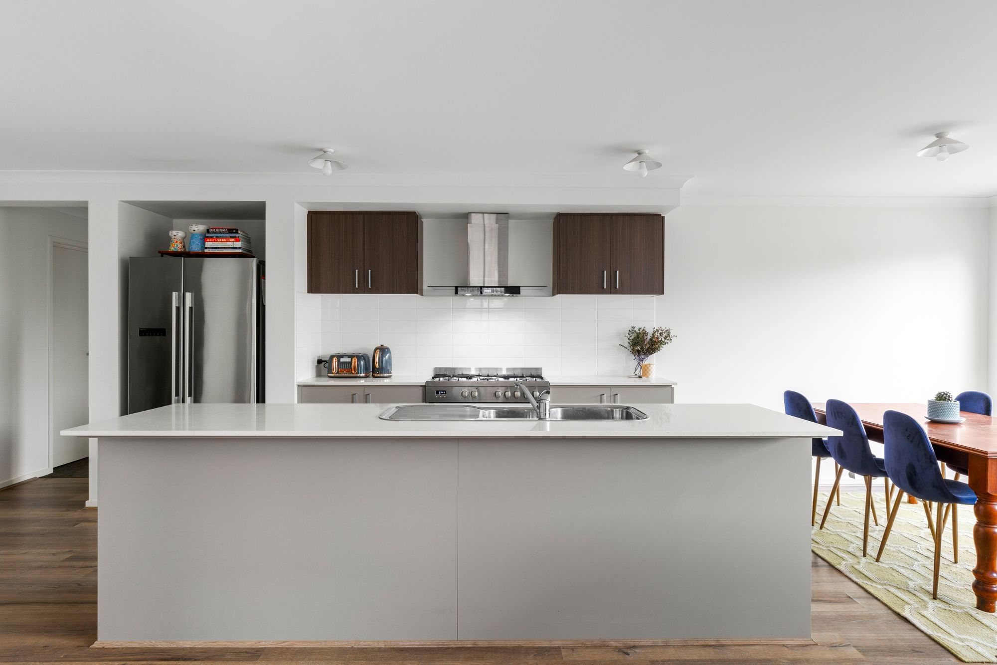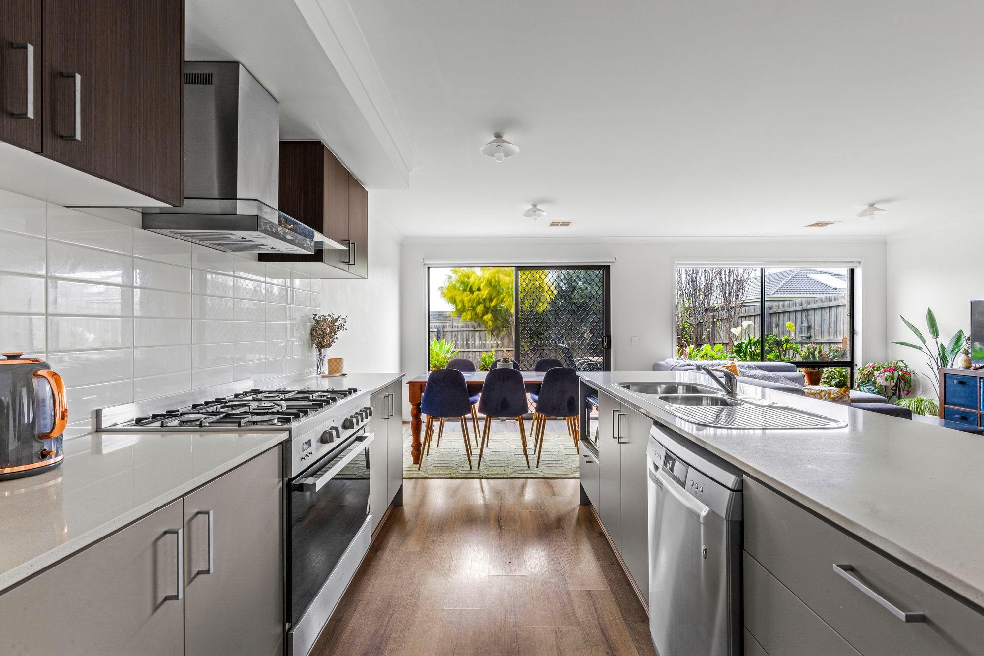 Kitchen: 20mm Stone Island Bench-top, large walk-in pantry, 900mm stainless steel oven and range hood, large fridge cavity, double sink, tiled splash back, overhead cabinets, microwave cavity, ducted heating and reverse cycle cooling, hybrid flooring.