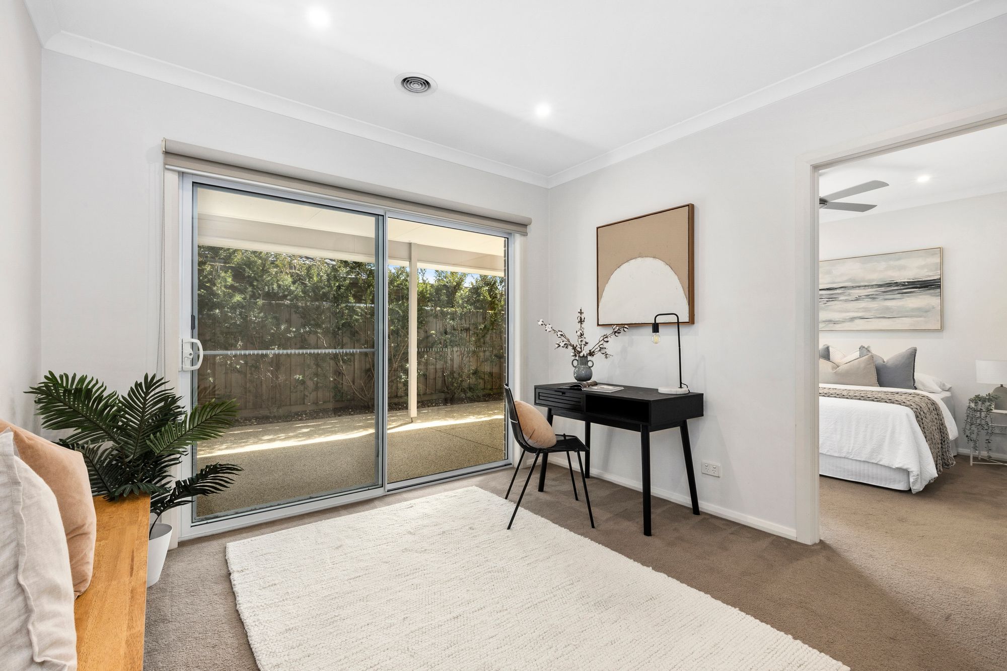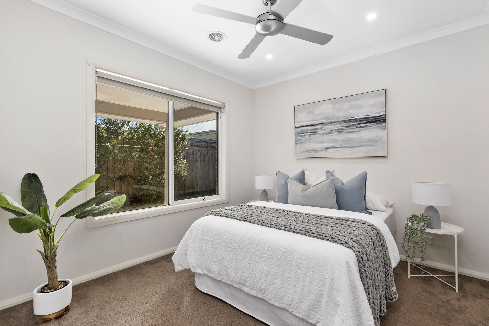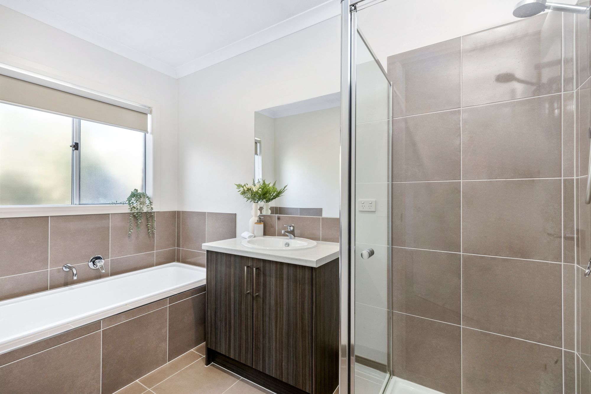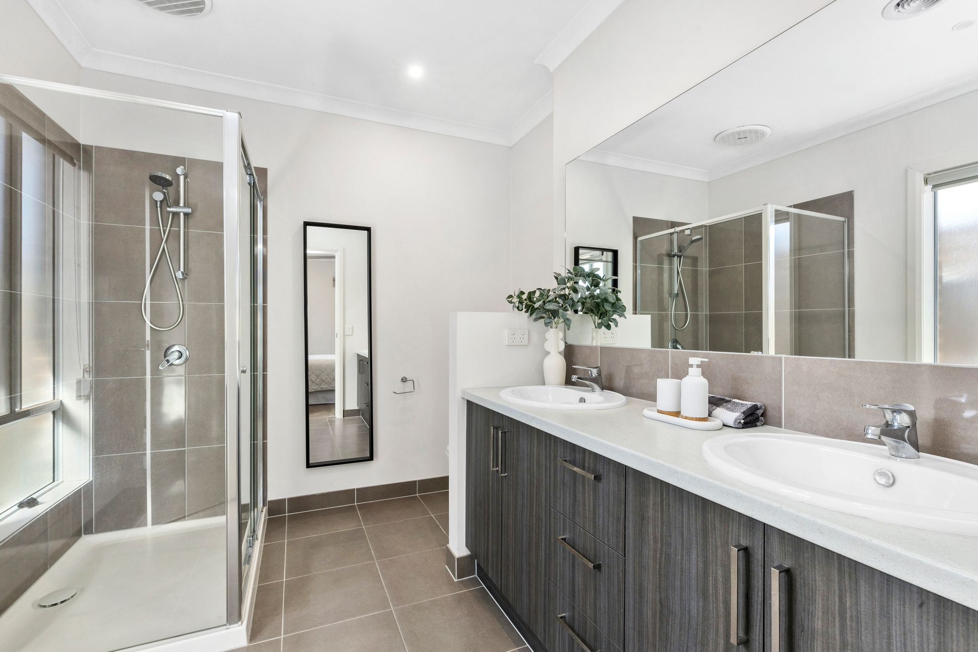 Master bedroom: Carpet, ceiling fan, large window with roller blinds, ducted heating, large walk in robe, downlights, Ensuite: large semi frameless shower, tile flooring, extended mirror splash backs, twin basin and vanity with ample storage, chrome fittings, toilet.