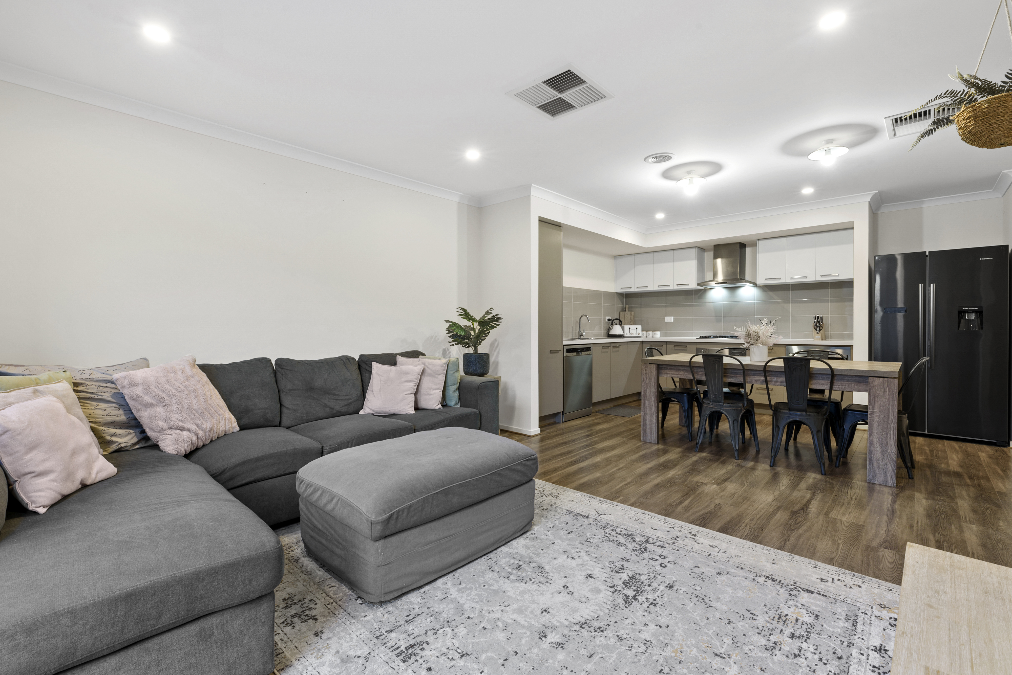 Living: open plan adjoining living/dining/kitchen, timber laminate flooring throughout, ducted heating, downlights, roller blinds, evaporative cooling, sliding doors to outdoor area
