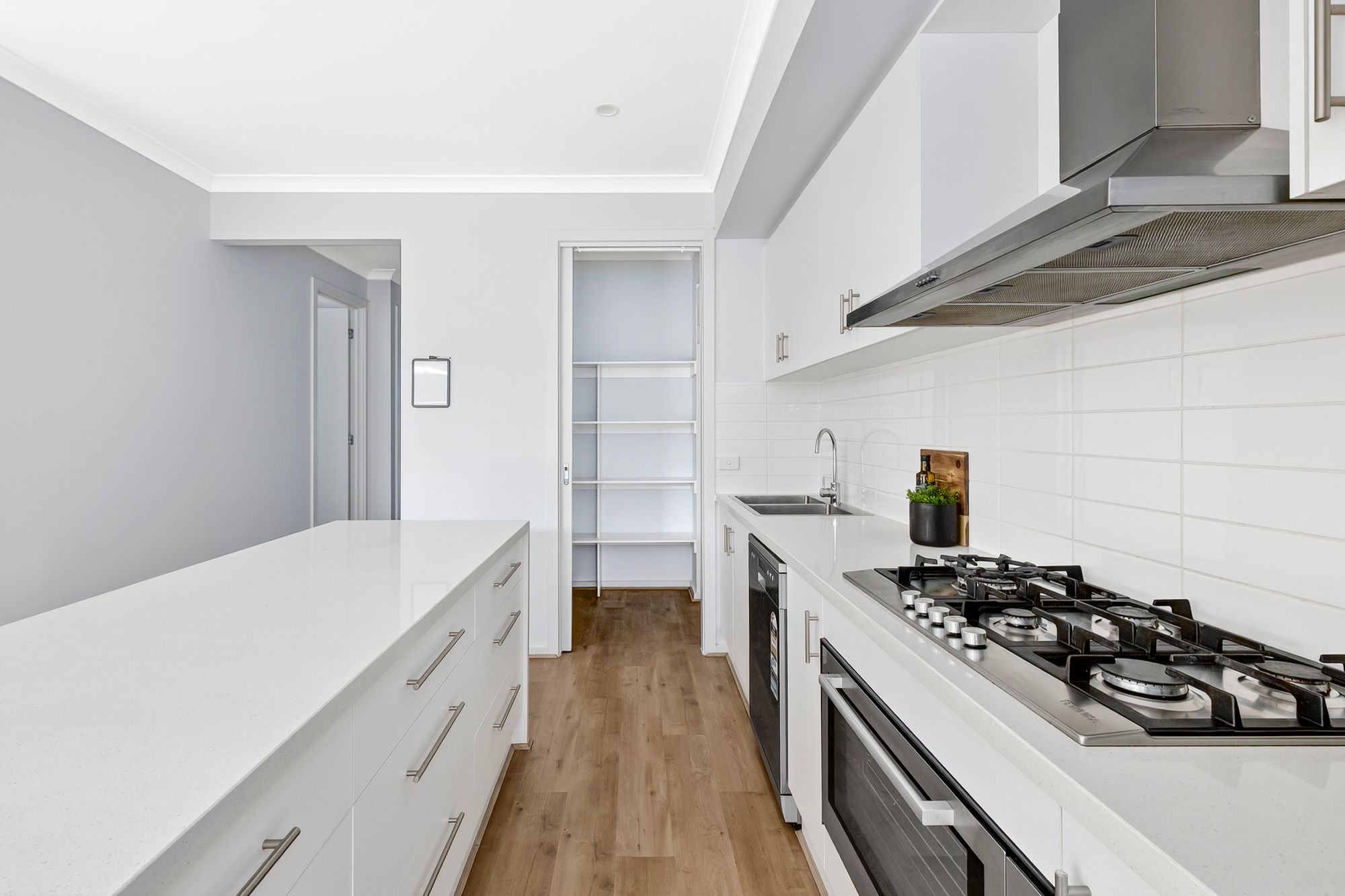 Kitchen: The heart of the home is a thoughtfully designed kitchen featuring a 900mm stovetop, oven, and rangehood, paired with a 600mm dishwasher for effortless meal preparation. 40mm stone benchtops with drop-end panels provide both style and practicality, complemented by upgraded cabinetry including overhead storage and pot drawers. A double bowl sink with brushed chrome fittings, a large fridge cavity, and a walk-in pantry complete the space. Ducted heating and evaporative cooling ensure comfort year-round.