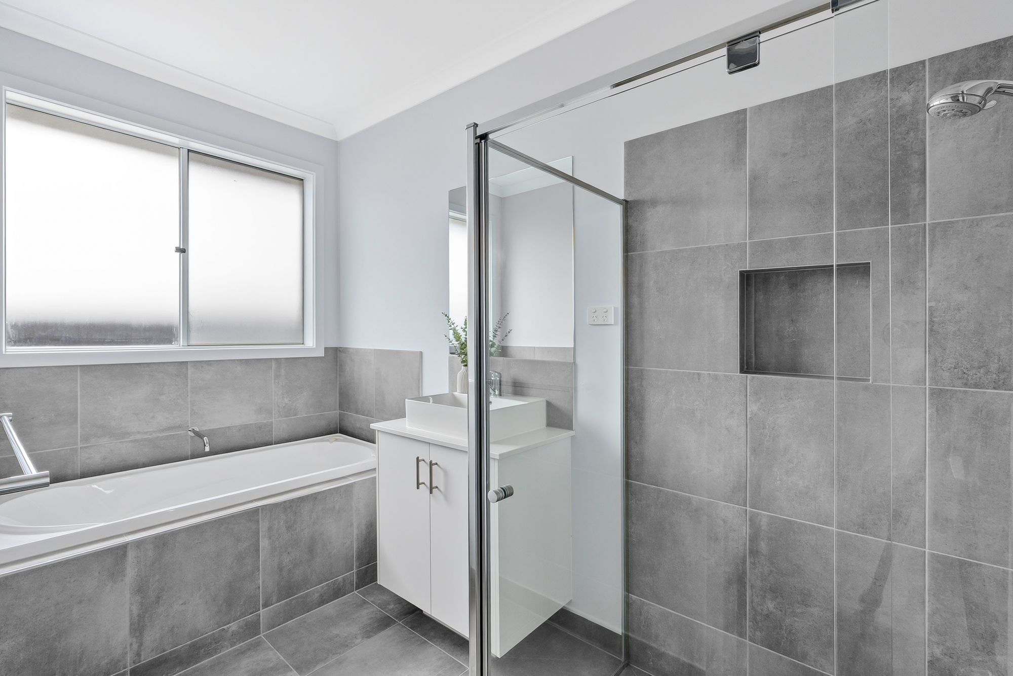 Additional Bathroom: A well-appointed secondary bathroom features a single vanity with 20mm stone benchtops, underbench cabinetry, a raised bath, shower with wall-mounted showerhead, and a separate toilet, catering perfectly to family needs.