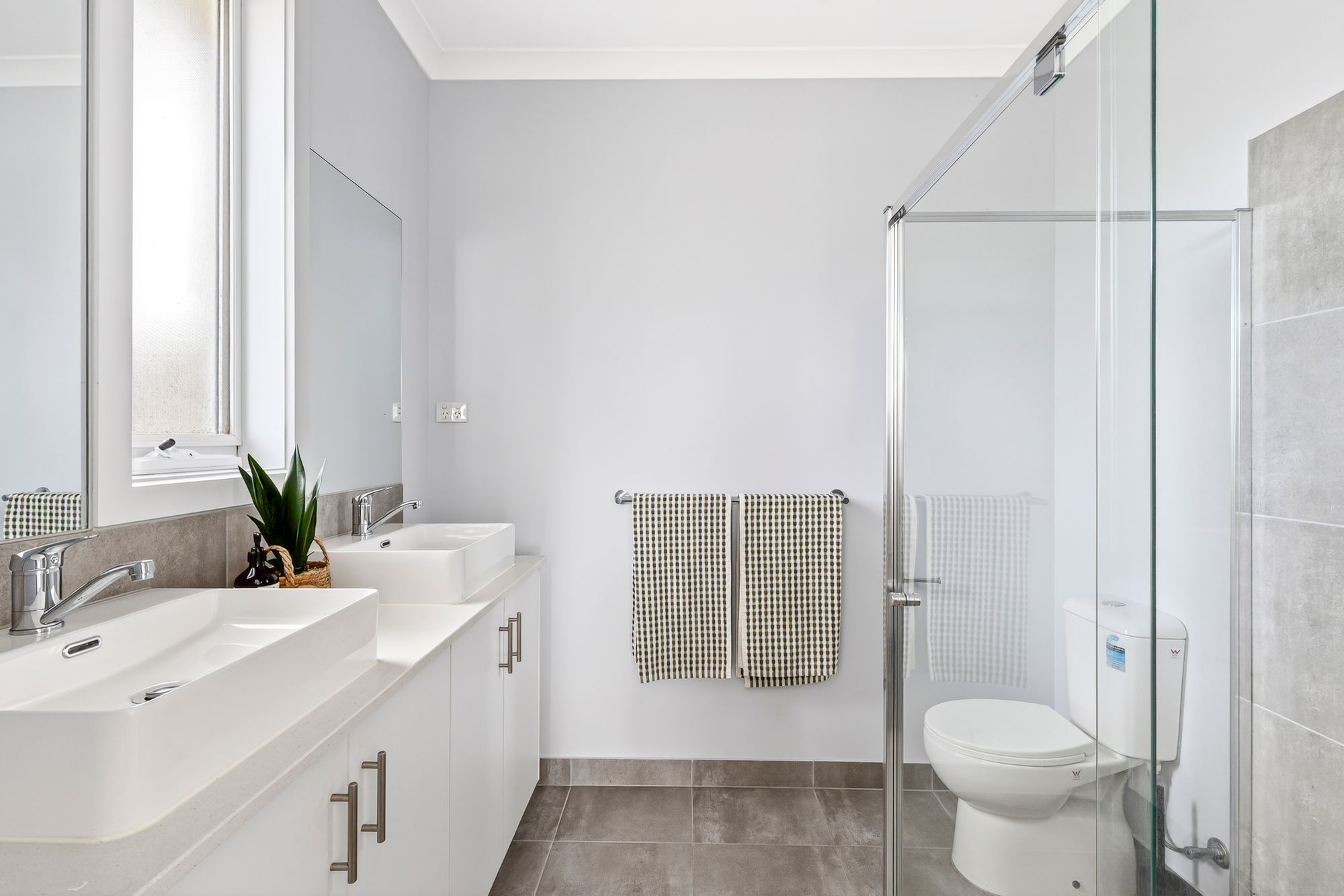 Ensuite: The ensuite showcases a dual vanity with 20mm stone benchtops, underbench cabinetry, and a mirror splashback. A wide tiled shower with wall-mounted and handheld showerheads, together with an open toilet design, offers a modern and luxurious finish.