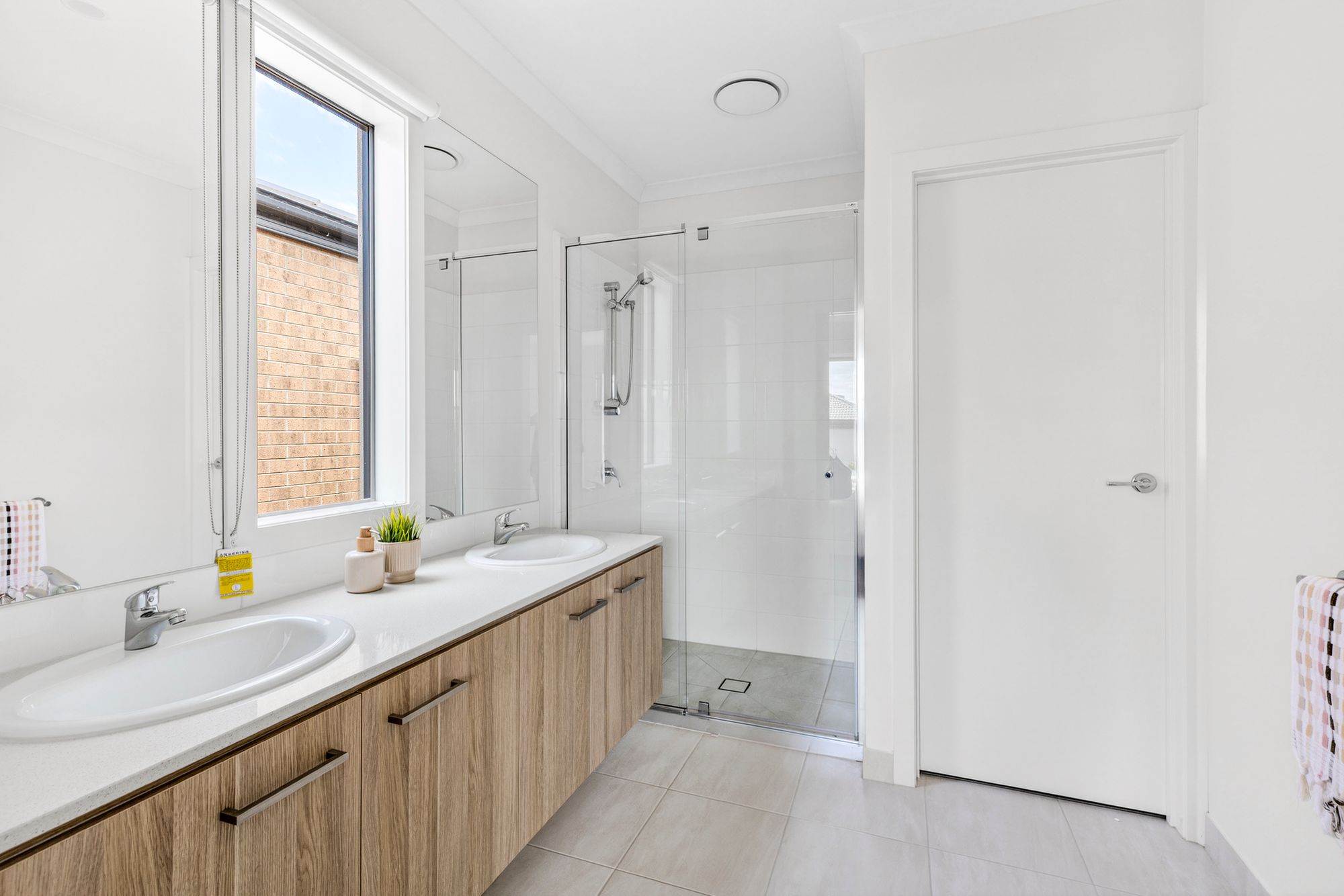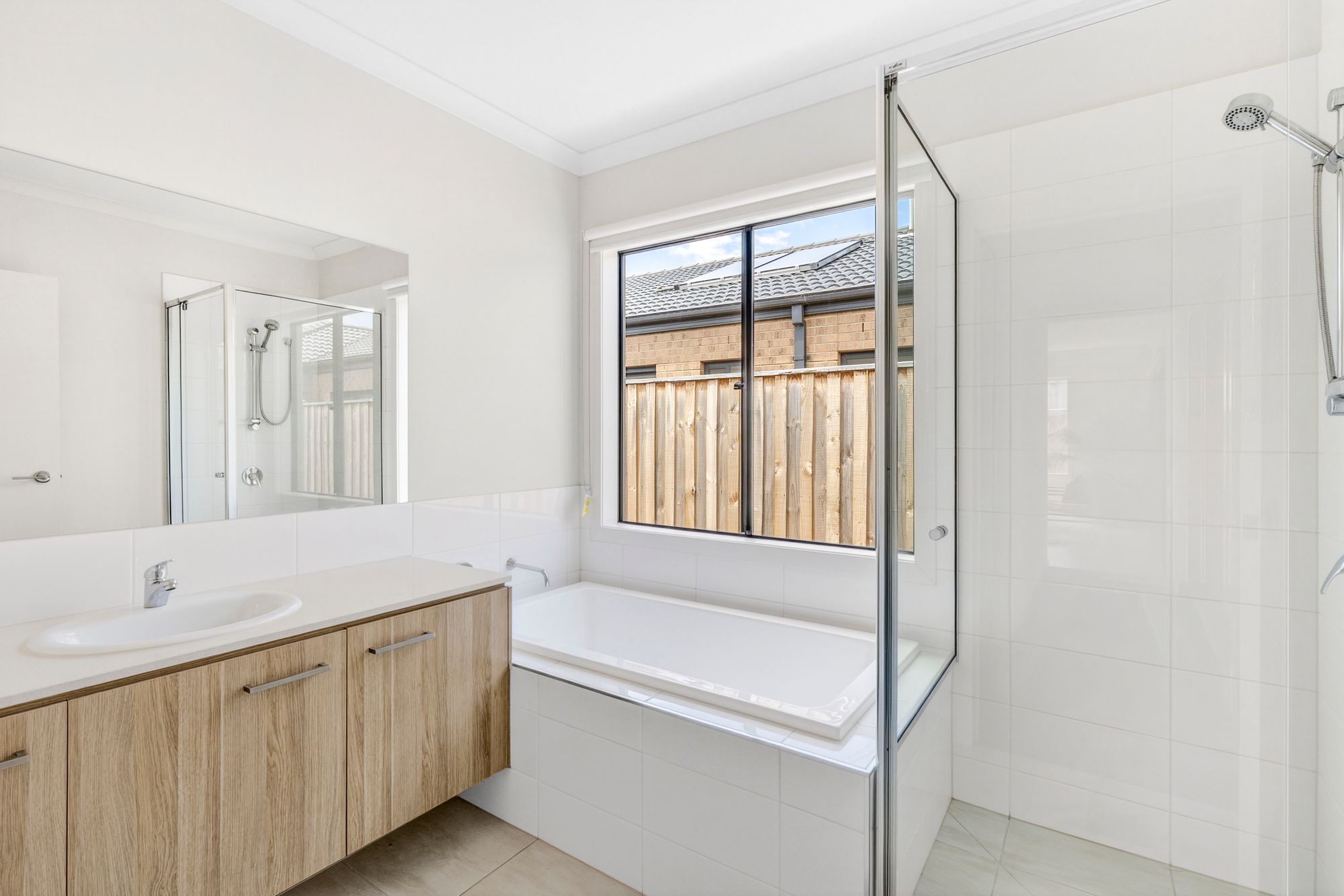 Additional Bathrooms: The central bathroom is well-appointed with a single vanity and basin featuring 20mm stone benchtops and cabinetry, a raised bath, mirrored splashback, and a shower. A wide window with roller blinds allows natural light, while a separate toilet enhances functionality for family living.