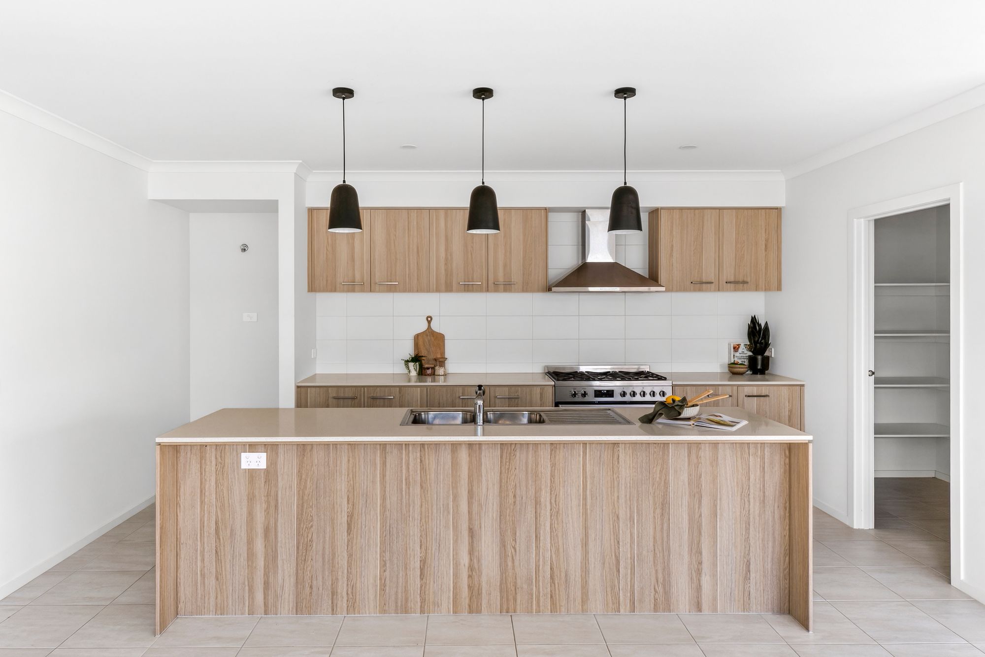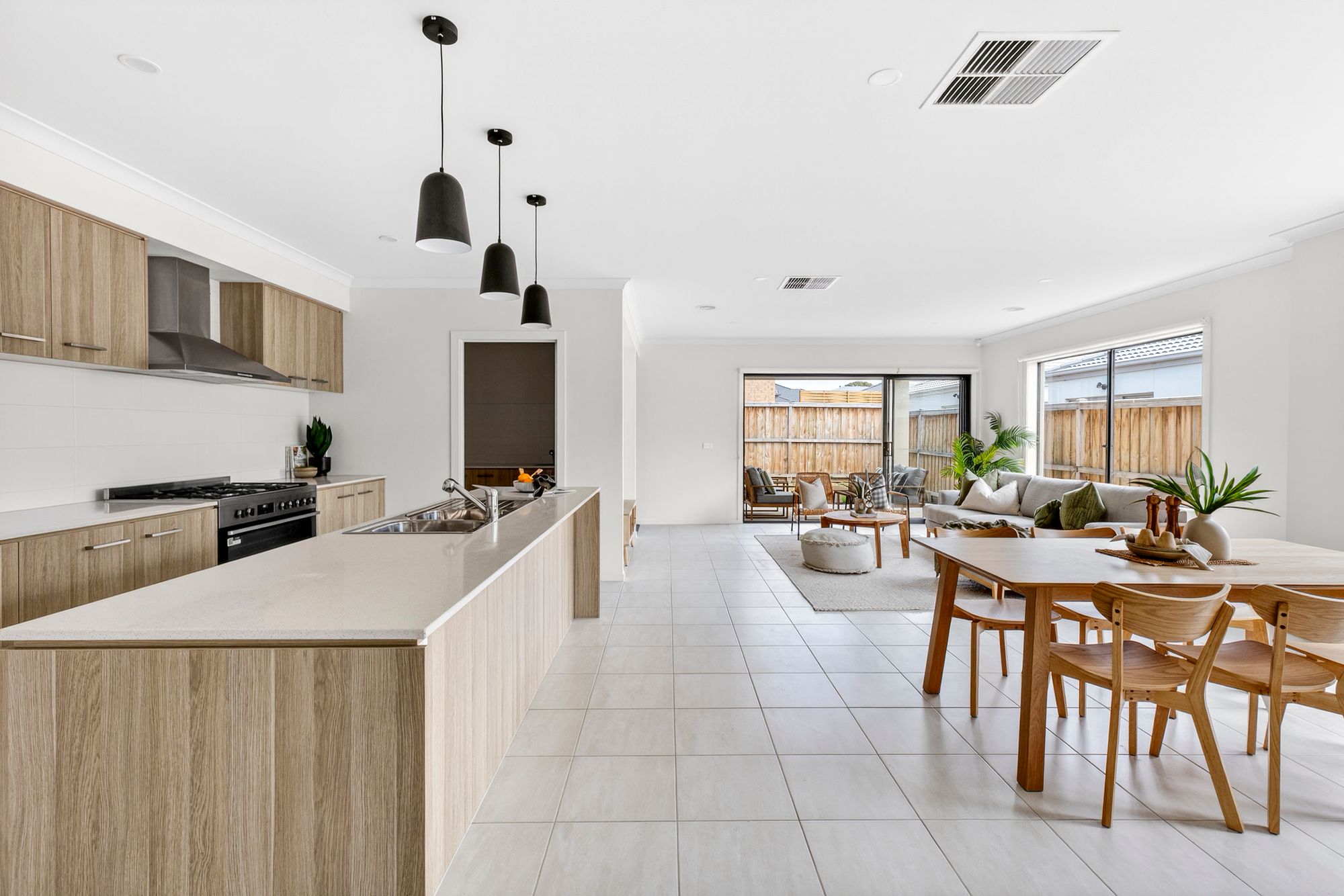Kitchen: The kitchen is a true centrepiece of the home, combining scale with premium inclusions. Appointed with 20mm stone benchtops and a tiled splashback, the space is enhanced by high ceilings and a dual basin sink. A 900mm freestanding oven and stovetop with rangehood caters perfectly to home chefs, while the butler’s pantry provides additional shelving, 20mm stone benchtops, extensive cabinetry and an additional sink for seamless entertaining. Downlights and pendant lighting over the island bench add warmth and sophistication, complemented by upgraded cabinetry including overhead storage and a large fridge cavity with water point. Ducted heating and evaporative cooling ensure year-round comfort.