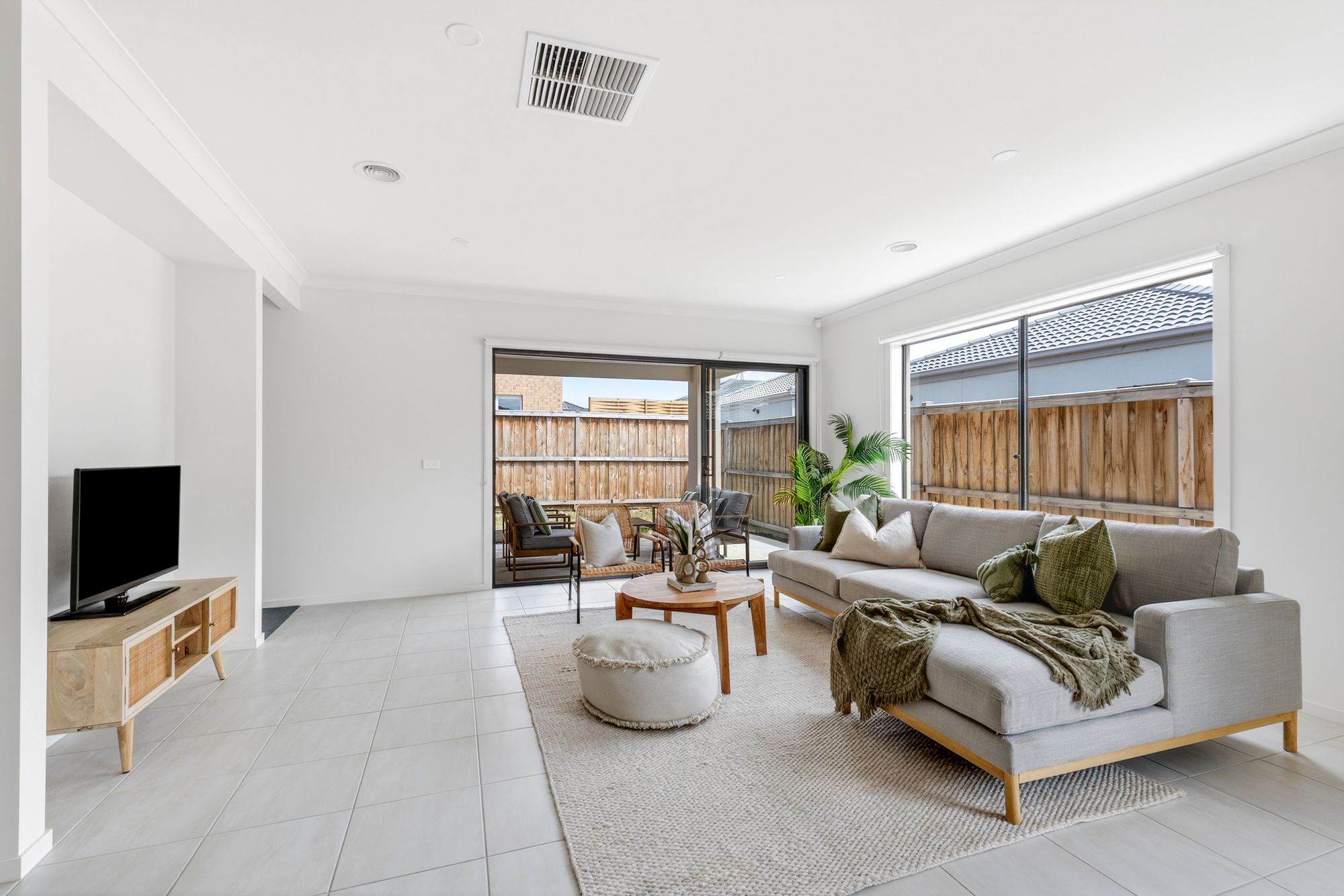 Open Plan Living/Dining: The open plan living and dining zone is generously proportioned and bathed in natural light, highlighted by high ceilings and downlights throughout. Wide windows fitted with roller blinds frame the space, while ducted heating and evaporative cooling maintain consistent comfort. Glass sliding doors provide effortless access to the South-facing alfresco and expansive rear yard, creating a seamless indoor-outdoor connection ideal for entertaining.