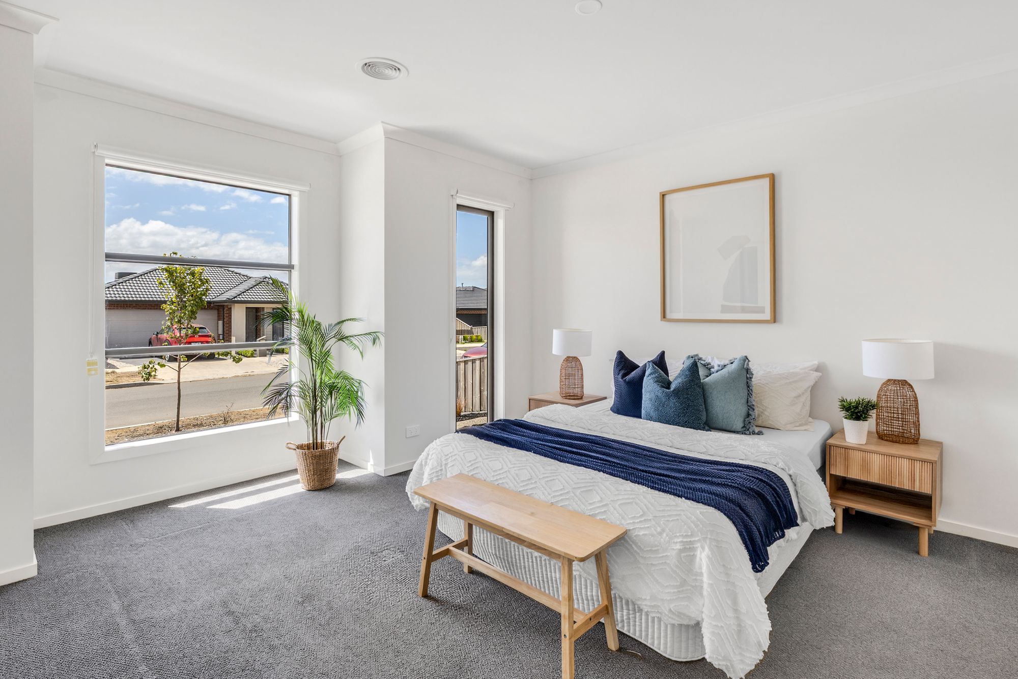 Master Suite: Privately positioned, the master suite is generously scaled and filled with natural light from North-facing windows. Soft carpet, wide windows with roller blinds, downlights, and ducted heating and evaporative cooling ensure comfort in every season. Dual walk-in robes provide abundant storage, while the stylish ensuite showcases a large vanity with dual basins, 20mm stone benchtops, upgraded cabinetry, a large mirror, wide shower, and private toilet, delivering both practicality and contemporary appeal.